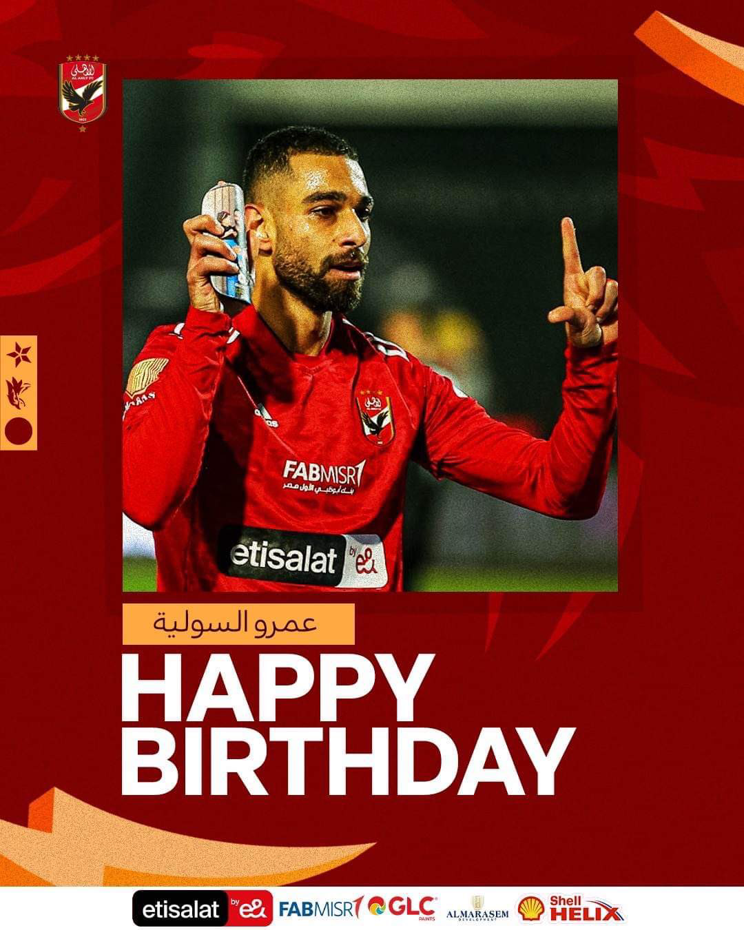 ونشر الحساب الرسمي للنادي الأهلي عبر فيس بوك صورة لعمرو السوليه وعلق عليها قائلا" نحتفل اليوم بعيد ميلاد لاعبنا عمرو السوليه تتمنى لك عيد ميلاد سعيد'.