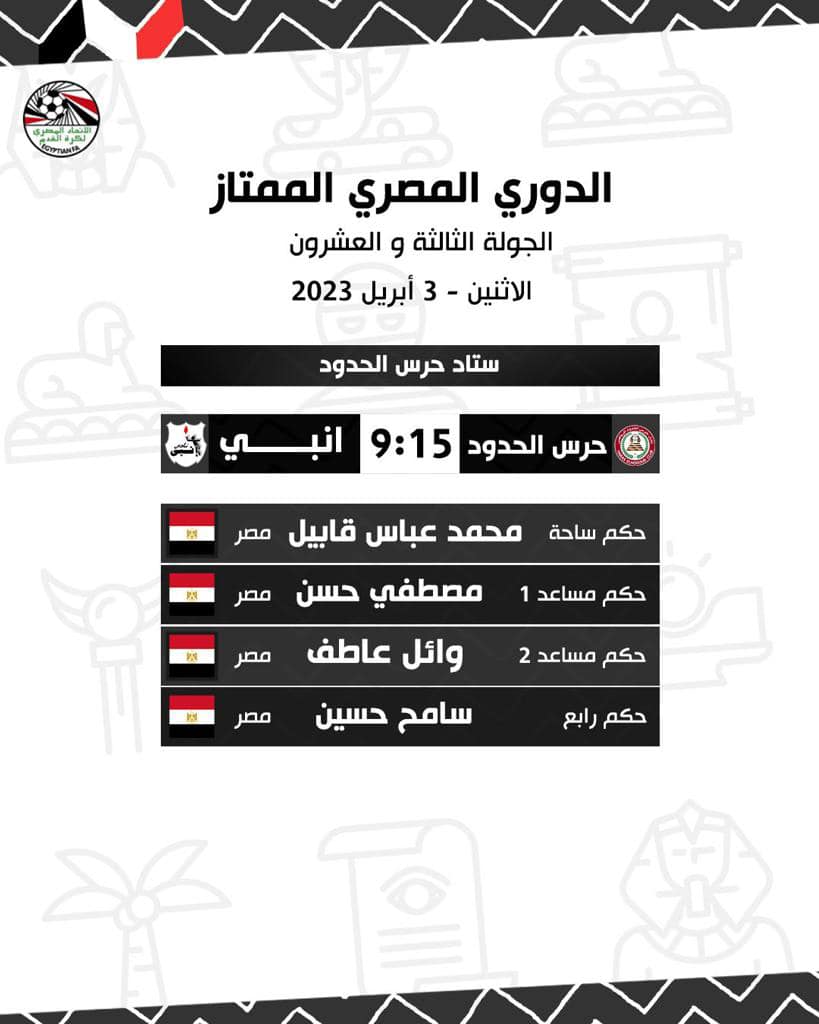الدوري المصري، أعلنت لجنة الحكام الرئيسية بالاتحاد المصري لكرة القدم حكام مباريات غدا الاثنين ضمن مواجهات الجولة 23 من الدوري المصري الممتاز، ولم تتضمن أطقم حكام مباريات الغد وجود حكام لتقنية حكم الفيديو "var".