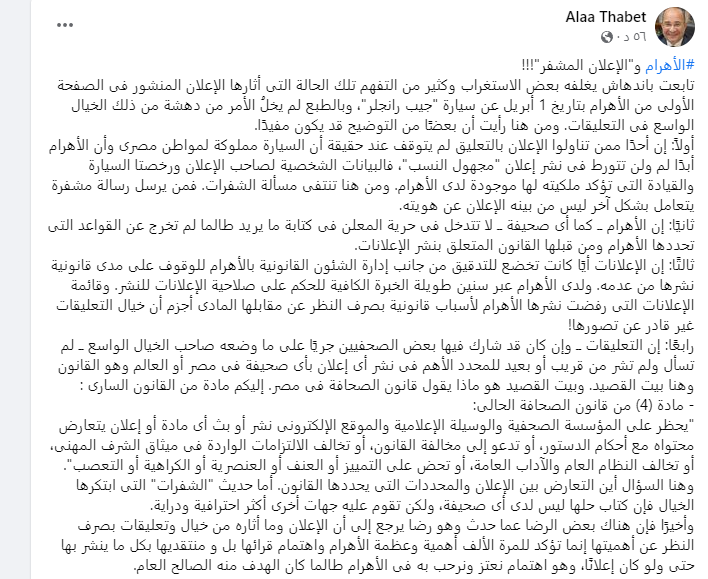 رد علاء ثابت رئيس تحرير الأهرام على الجدل المثار بسبب أحد الإعلانات المنشورة على الصفحة الأولى لـ صحيفة الأهرام اليومية بتاريخ 1 أبريل والخاص بإحدى السيارات.