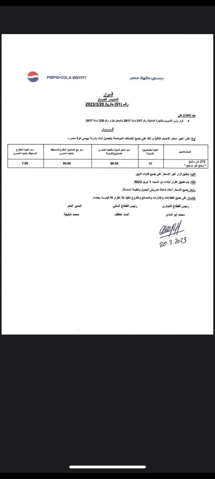تفاصيل الزيادة الجديدة في أسعار بيبسي كولا (مستند)