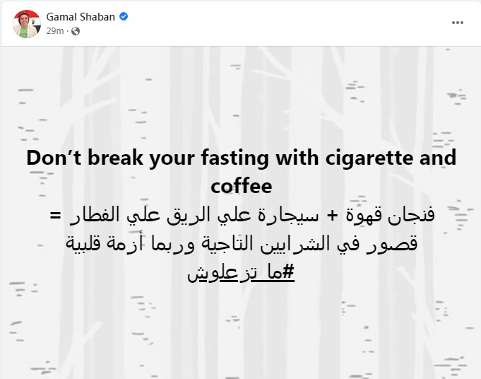 وعن قصور الشريان التاجي، كتب الدكتور جمال شعبان تدوينة، عبر حسابه بالفيس بوك، قال فيها: ""Don’t break your fasting with cigarette and coffee فنجان قهوة + سيجارة علي الريق علي الفطار = قصور في الشرايين التاجية وربما أزمة قلبية #ما_تزعلوش"