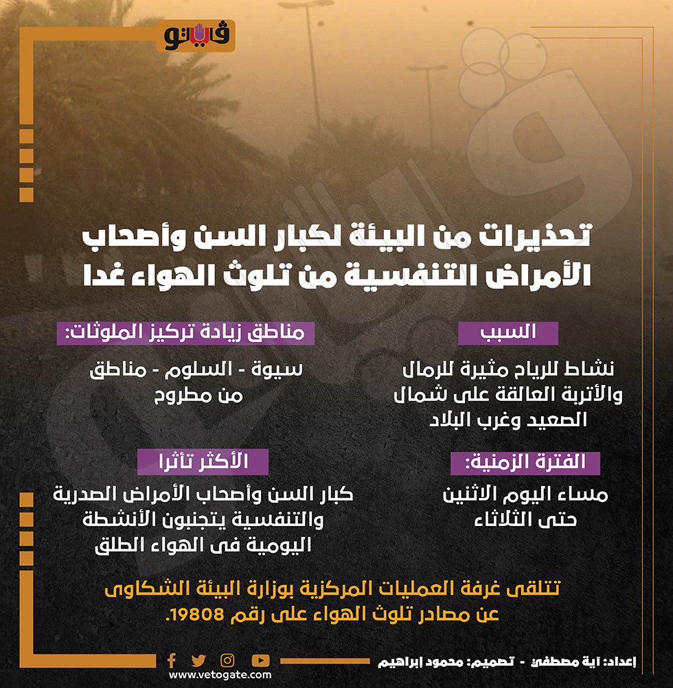 تحذيرات من البيئة لكبار السن وأصحاب الأمراض التنفسية من تلوث الهواء غدا (إنفوجراف) الإثنين 03/أبريل/2023 - 11:45 م 4/3/2023 11:45:09 PM وزارة البيئة، فيتو آية مصطفى شارك طباعة 18 حجم الخط شارك طباعة البيئة الامراض الصدريه أمراض الصدر انفوجراف رياح مثيرة للرمال تلوث الهواء غرفة العمليات المركزية