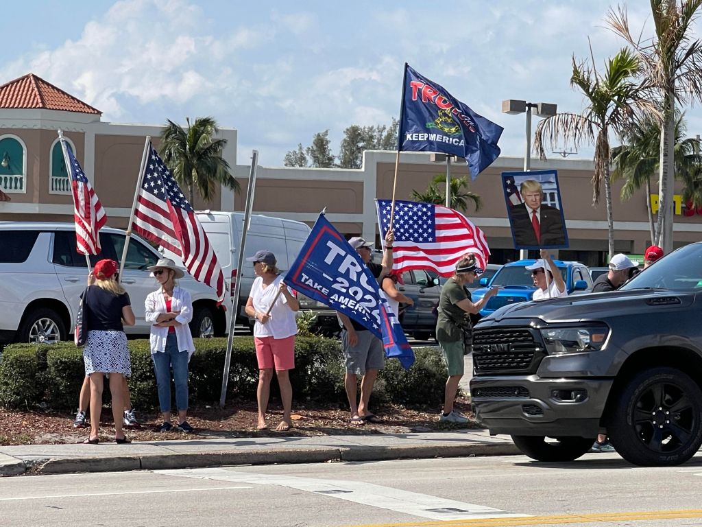 واصطف المؤيدون بالقرب من مطار بالم بيتش الدولي في فلوريدا، ولوح العشرات من المعجبين بالرئيس الأمريكي السابق والمرشح الحالي بأعلام "ترامب 2024" العملاقة ولوحوا بلافتات محلية الصنع تعرض رسائل مثل "بارك الله دونالد ترامب".