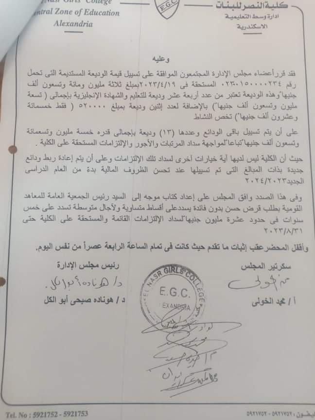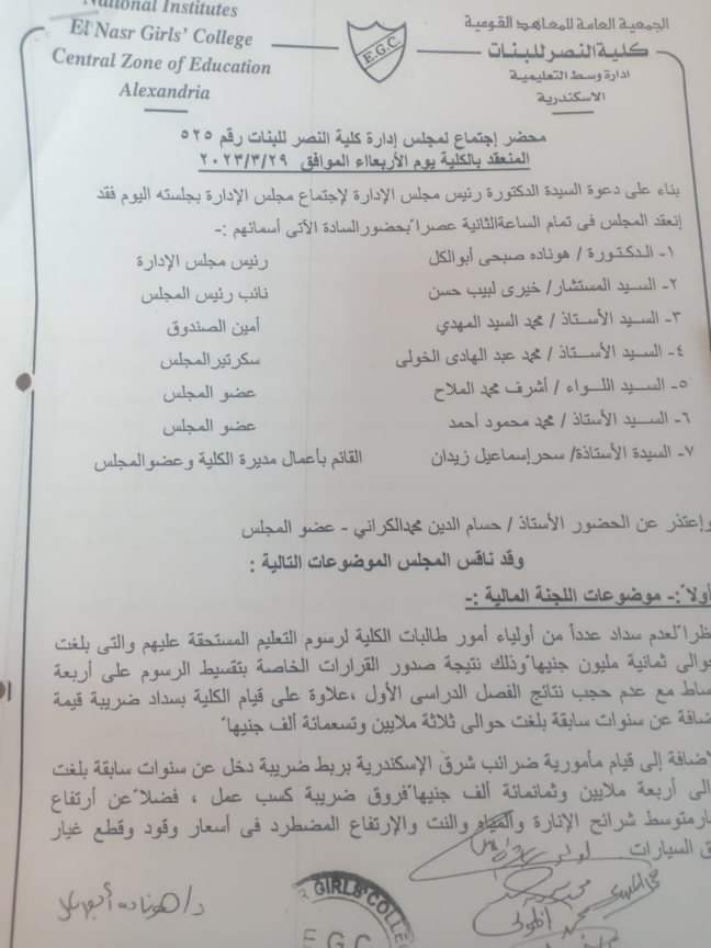 وتعجب المصدر، من تسريب محضر اجتماع مجلس إدارة المعاهد القومية واستقطاع جزء منه ونشره علي صفحات موقع التواصل الاجتماعي فيس وتصوير الأمر على أننا نفلس والمدارس تغلق على غير الحقيقة، لافتا إلى أن كلية النصر للبنات egc هي من أعرق المدارس القومية والتي أنشأت منذ عام 1935 على يد السير هنري باركر وكان اسمها الكلية الإنجليزية وتحول اسمها الي كلية النصر للبنات عقب تأميمها عام 52 وتخرج منها مشاهير عالميا ونجوم سكندريون وما تم شئ مقصود، مطالبا أولياء الأمور بالتعاون مع الإدارة وسد المتأخرات عليهم حتى تسير الأمور كما كانت من قبل.