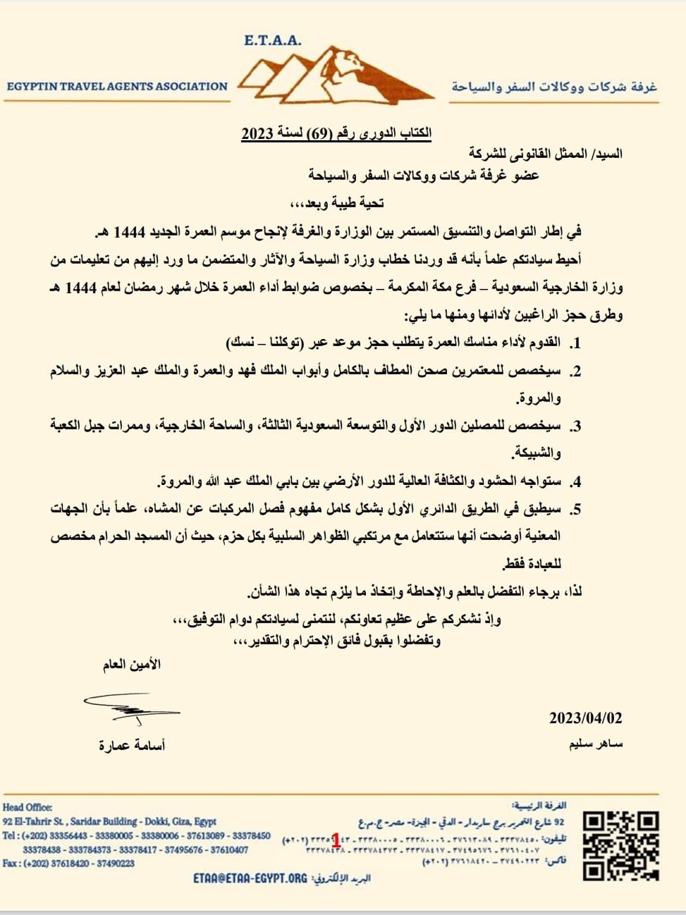 يذكر أن وزارة السياحة والآثار أعلنت عن اتخاذ قرارات جديدة لحل المشاكل التي تواجه شركات السياحة العاملة في موسم العمرة وخاصة فيما يتعلق في حجز رحلات الطيران للمسافرين لعمل مناسك عمرة شهر رمضان.