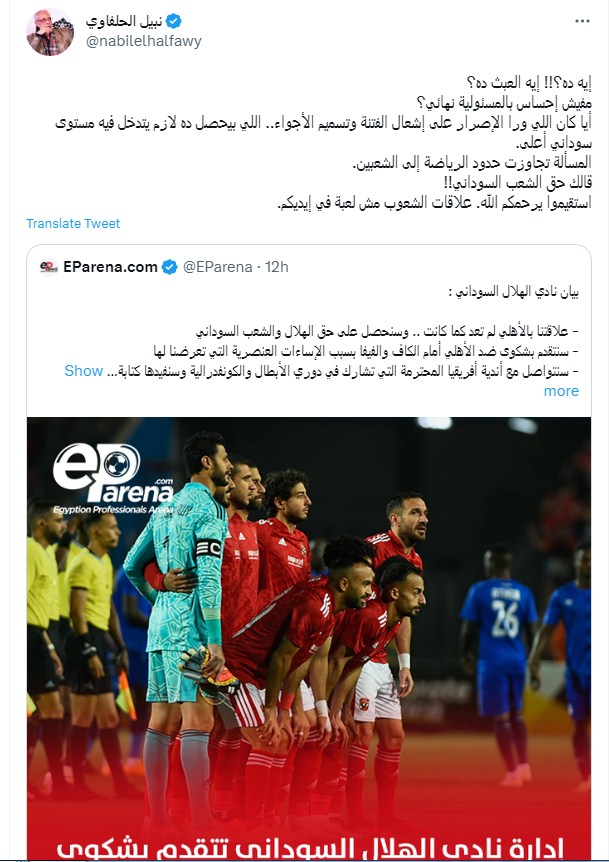 وتابع نبيل الحلفاوي رده على بيان نادي الهلال السوداني فقال: "المسألة تجاوزت حدود الرياضة إلى الشعبين. قالك حق الشعب السوداني!! استقيموا يرحمكم الله. علاقات الشعوب مش لعبة في إيديكم".