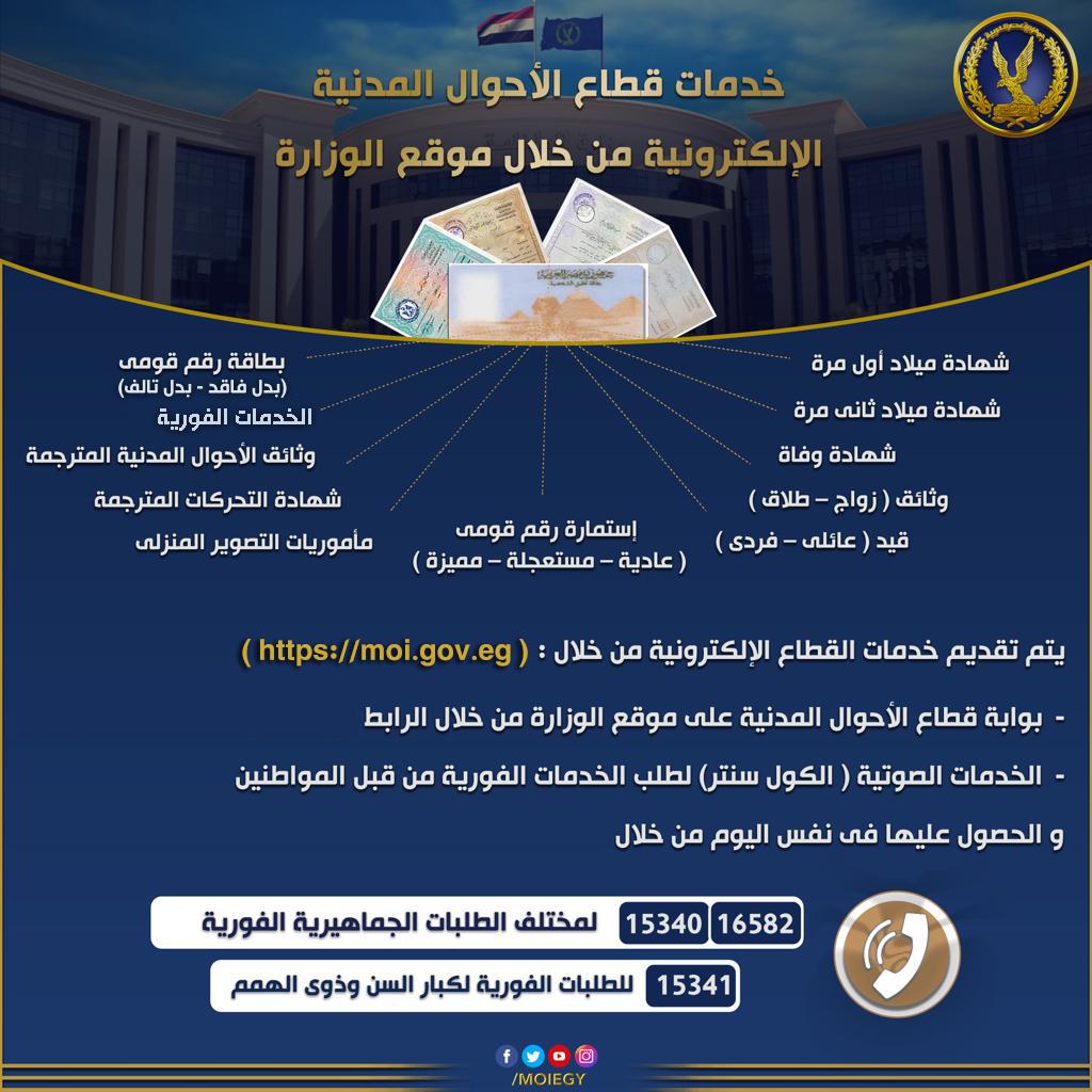 وقام قطاع الأحوال المدنية بتفعيل العديد من خدمات القطاع الإلكترونية من خلال موقع بوابة وزارة الداخلية على شبكة المعلومات الدولية "الإنترنت" من خلال الرابط () فضلًا عن تقديم الخدمات الصوتية " الكول سنتر" لطلب الخدمات الفورية والحصول عليها فى نفس اليوم من خلال الخط الساخن "15340- 16582" وكذا الخدمات الفورية لكبار السن وذوى الهمم والحالات المرضية والحصول عليها فى نفس اليوم من خلال الخط الساخن "15341".