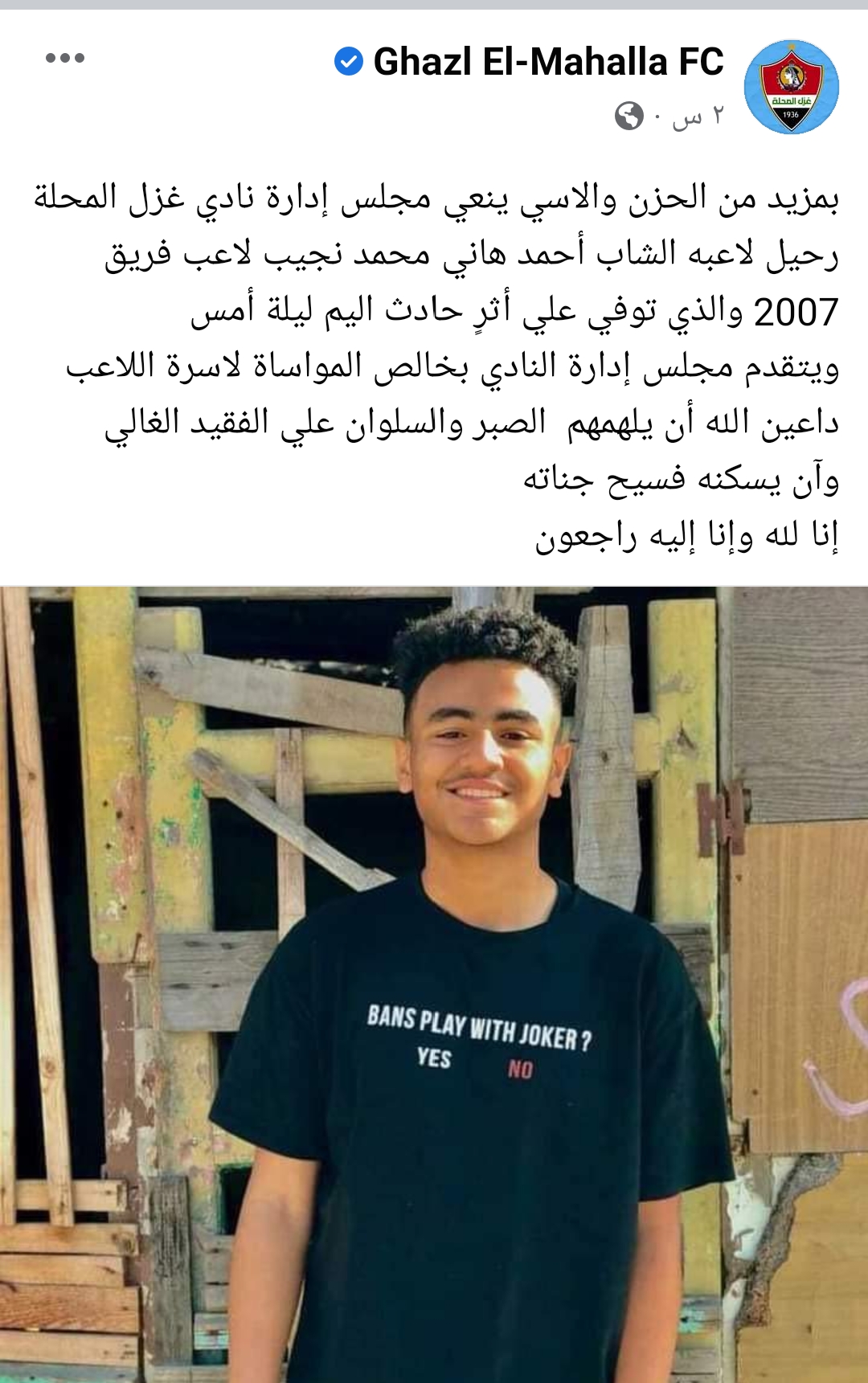 غزل المحلة ينعى أحمد هاني ناشئ النادي