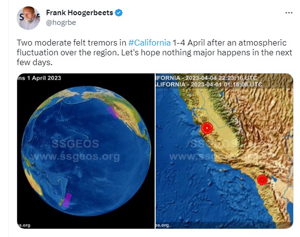 وعبر الباحث الهولندي فرانك هوجربيتس عن مخاوفة لحدوث زلزال مدمر الأيام المقبلة فقال: "تم الشعور بهزتين متوسطتي القوة في كاليفورنيا في ١ و٤ ابريل بعد تذبذب في الغلاف الجوي فوق هذه المنطقة. نتمنى ألا يحدث شيءًا كبيرًا خلال الأيام المقبلة".