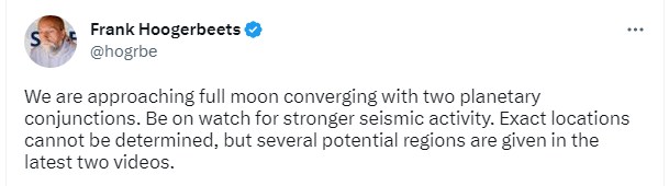 وقال فرانك هوجربيتس في تغريدة سابقة: "نحن نقترب من اكتمال القمر في وقت متقارب مع اقتران كواكبين. كونوا حذرين من نشاط زلزالي أقوى. لا يمكن تحديد المناطق بالضبط ولكن هناك عدة مناطق محتملة..."