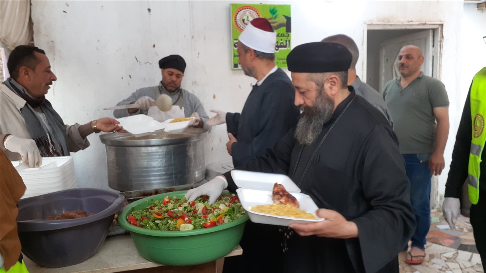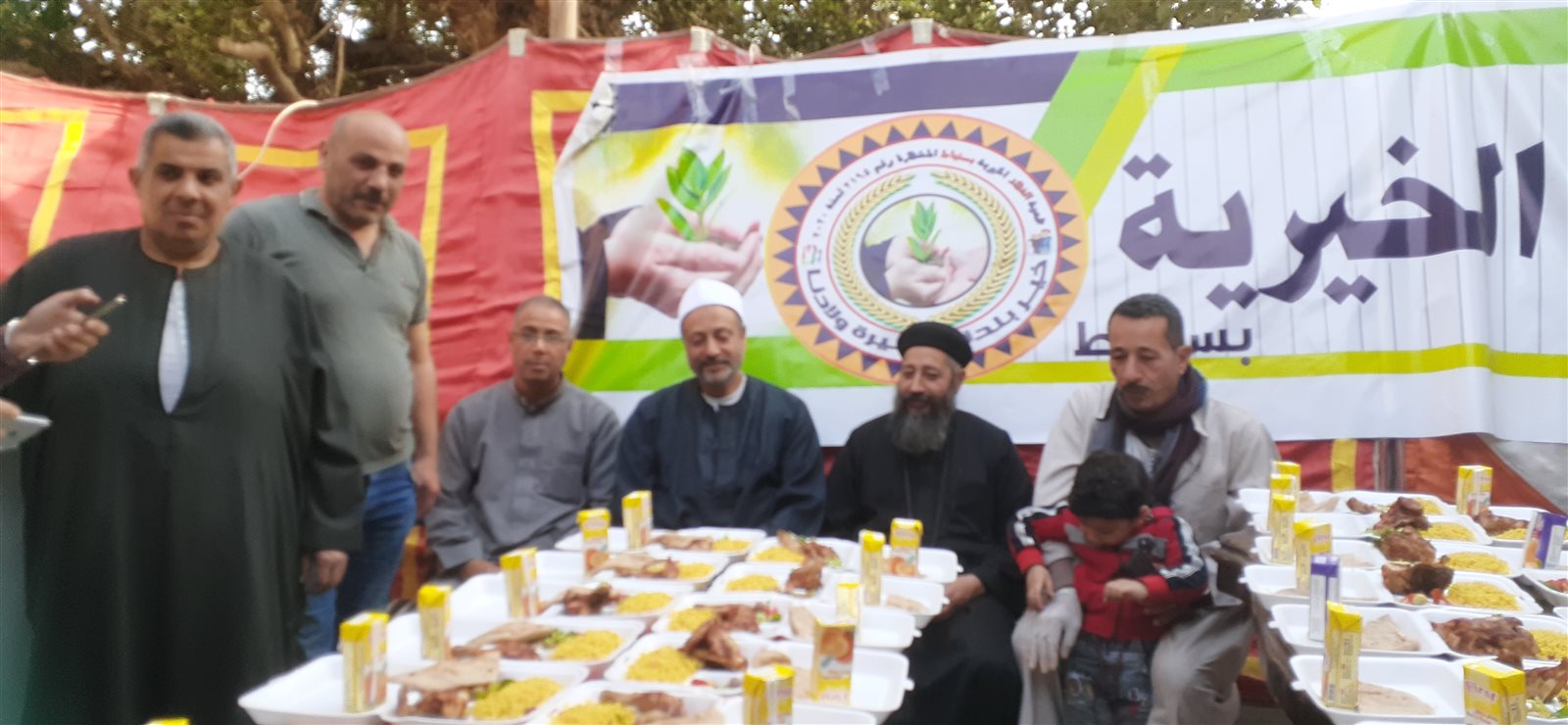 ووقف اليوم راعي الكنيسة قبيل أذان المغرب لتوزيع العصائر والوجبات وتنظيم حفل إفطار جماعي، الذي ينظمه أهل القرية كل عام فى شهر رمضان.