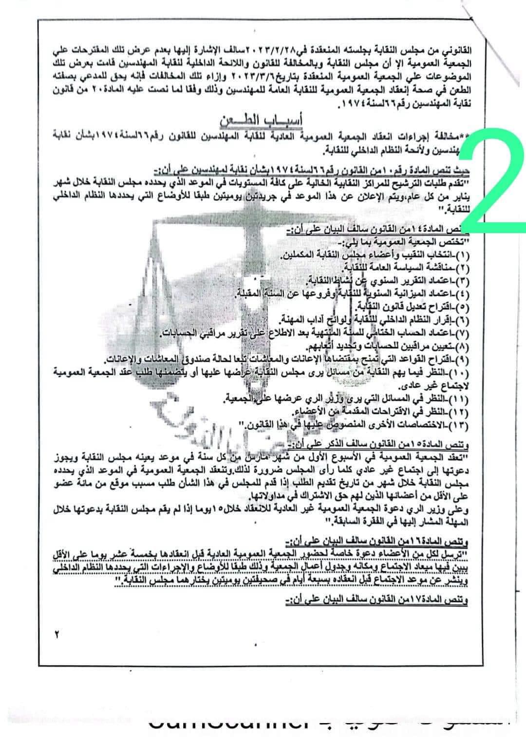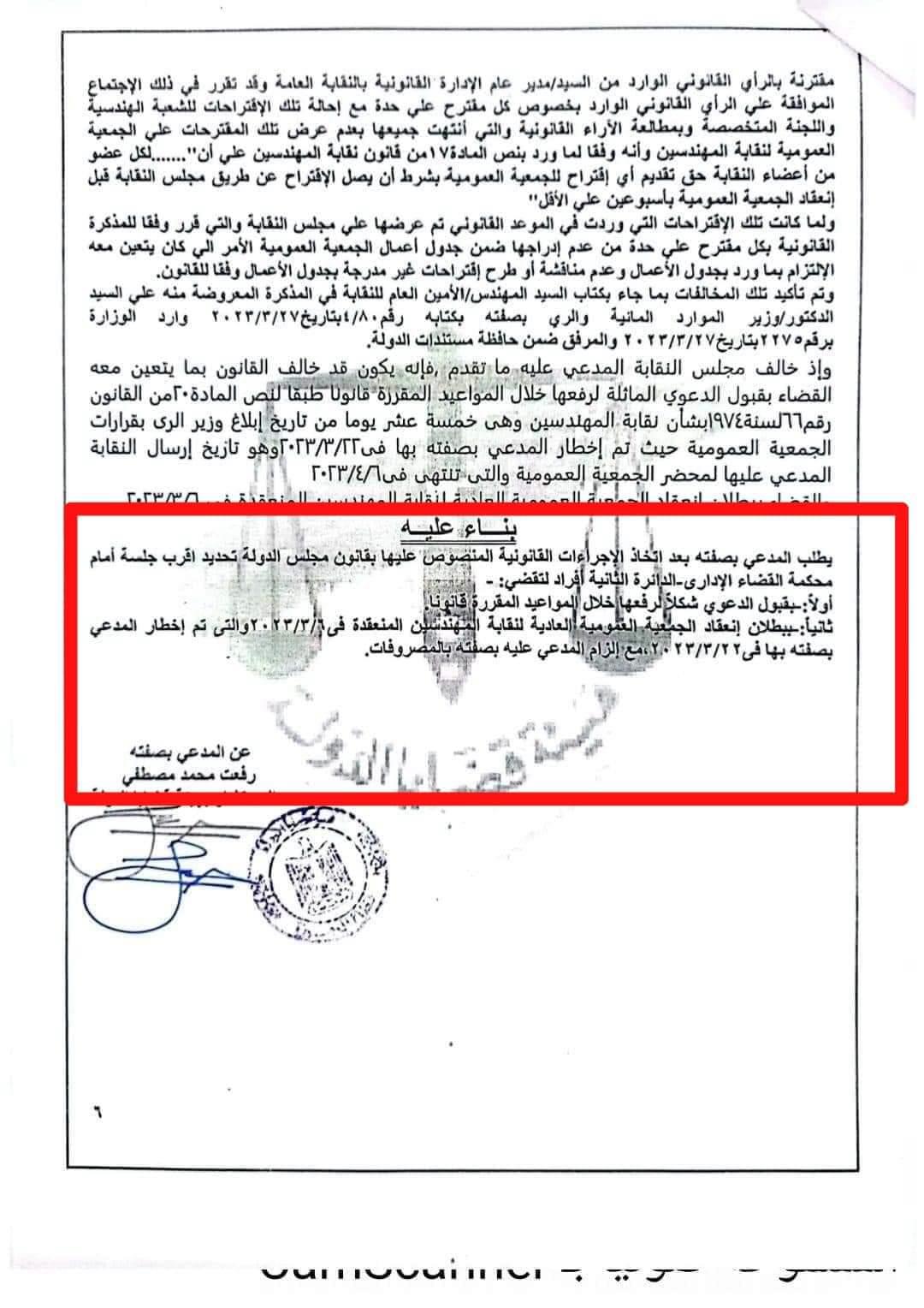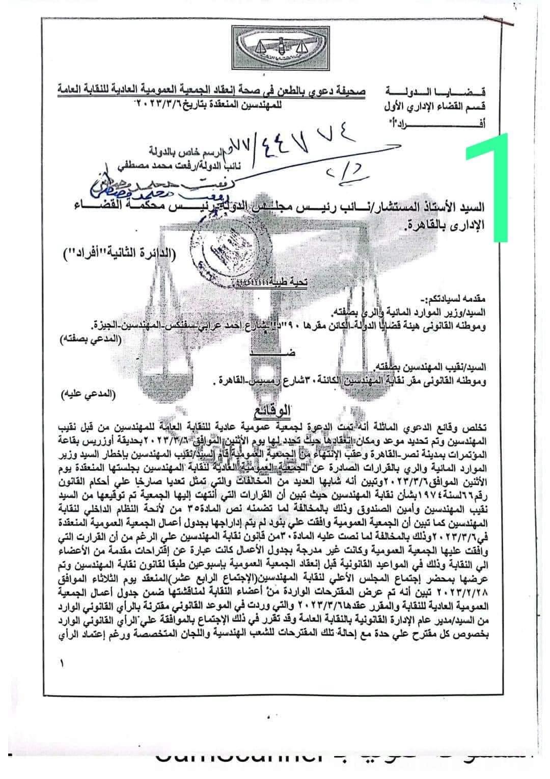 وتقدم عدد من أعضاء الجمعية العمومية لنقابة المهندسين بدعوى أمام القضاء الإداري، للطعن على الجمعية العمومية العادية ووقف تنفيذ قراراتها والتي عقدت يوم 6 مارس لعام 2023.