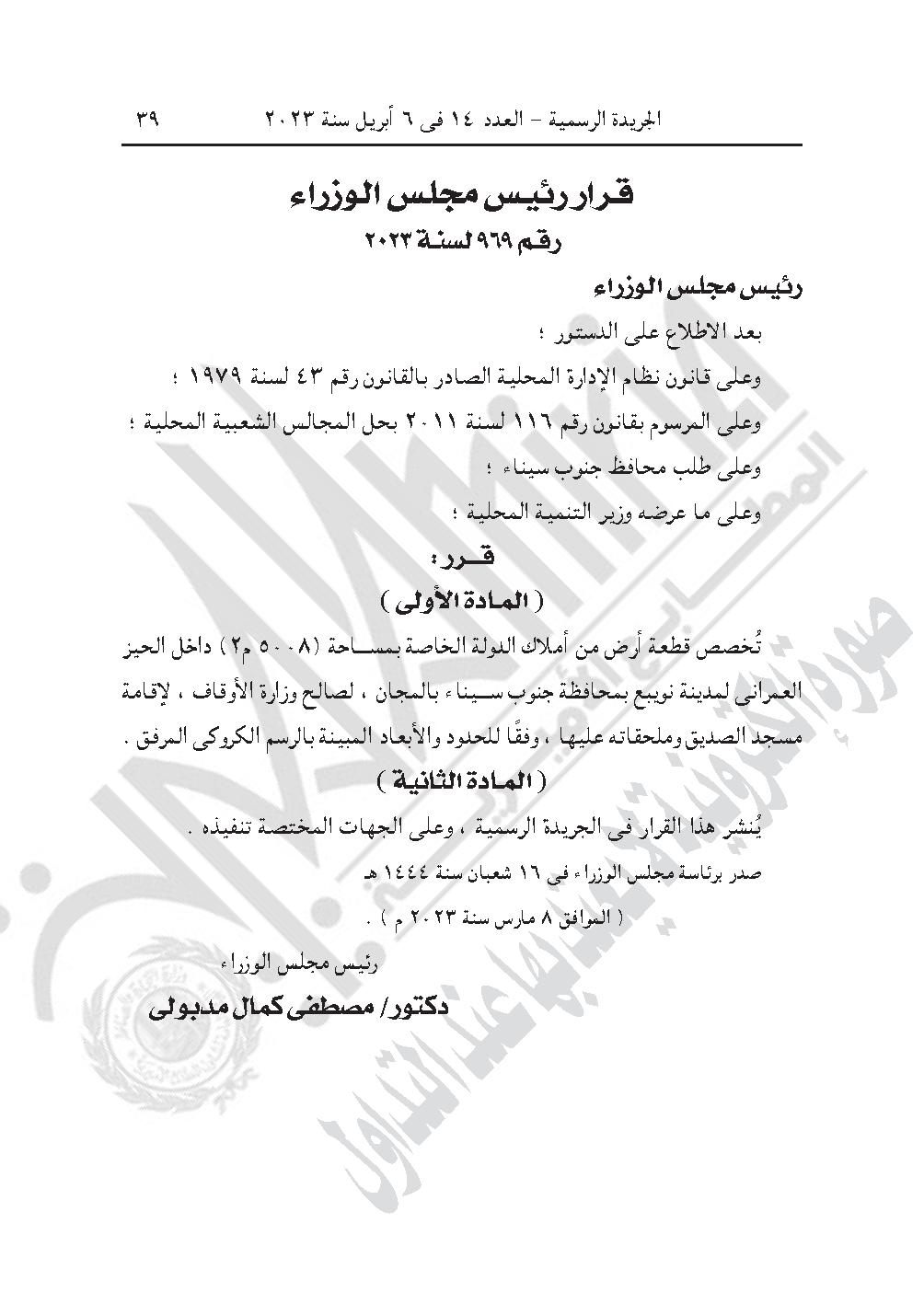 - قرار رئيس الوزراء رقم 969 لسنة 2023، بتخصيص قطعة أرض من أمالك الدولة الخاصة بمساحة 5008 متر مربع، داخل الحيز العمرانى لمدينة نويبع بمحافظة جنوب سيناء بالمجان، لصالح وزارة الأوقاف، لإقامة مسجد الصديق وملحقاته عليها.