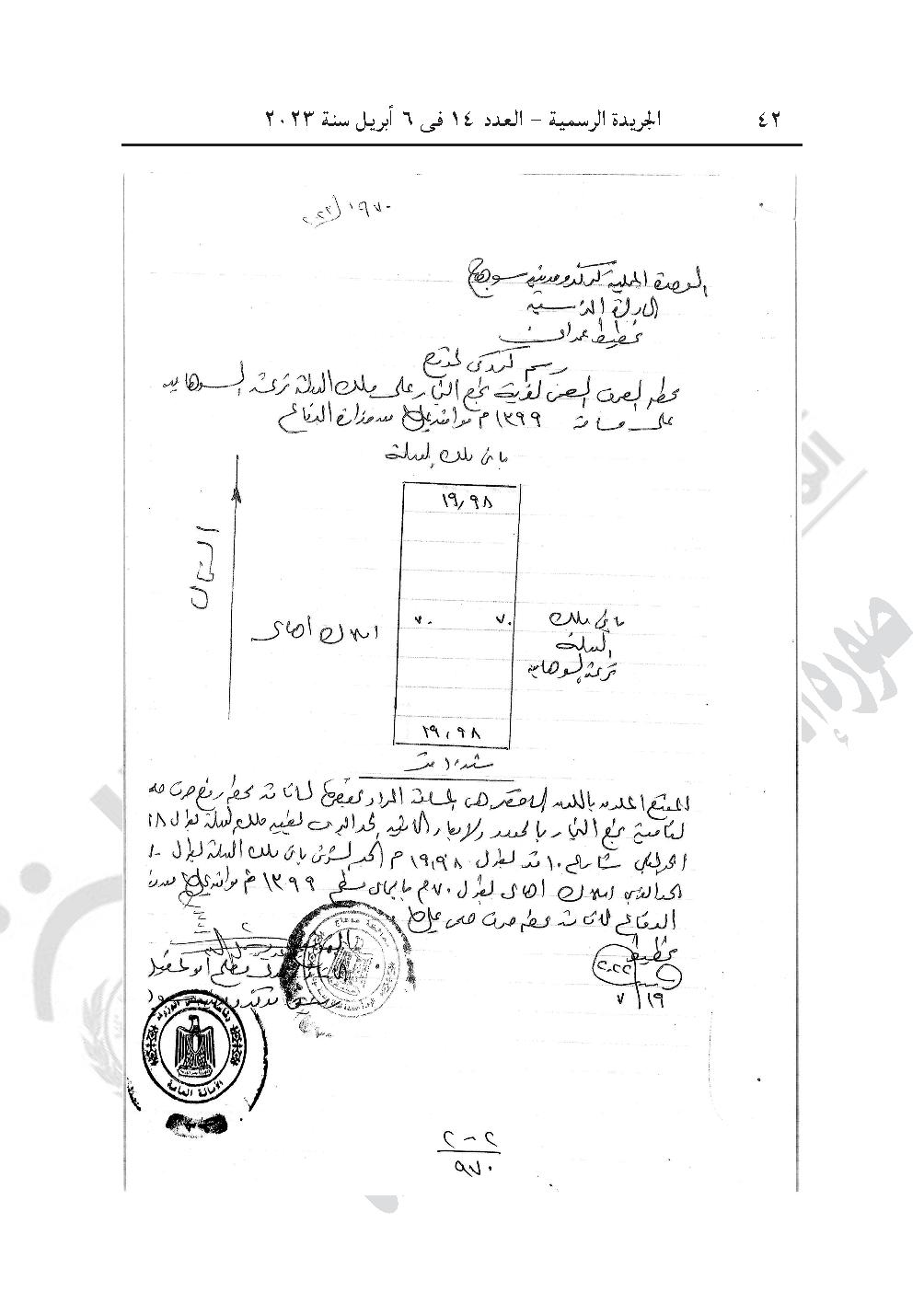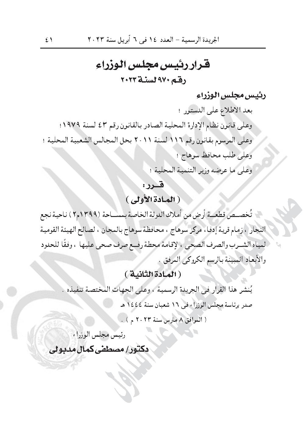 -وقرار رئيس الوزراء رقم 970 لسنة 2023، بتخصيص قطعة أرض من أملاك الدولة الخاصة بمساحة 1399 متر مربع، ناحية نجع النجار، زمام قرية إدفا، مركز سوهاج، بمحافظة سوهاج بالمجان، لصالح الهيئة القومية لمياه الشرب والصرف الصحى، لإقامة محطة رفع صرف صحى عليها.