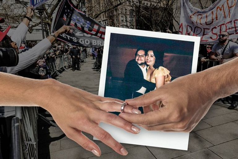 ووسط الحشد الذي وقف أمام محكمة مانهاتن الجنائية، قبل اعتقال الرئيس السابق ترامب،، كانت قصة حب بدأت منذ المدرسة الثانوية بين تشاندلر دين وكارولينا تريفينيو تتوج بالزواج.