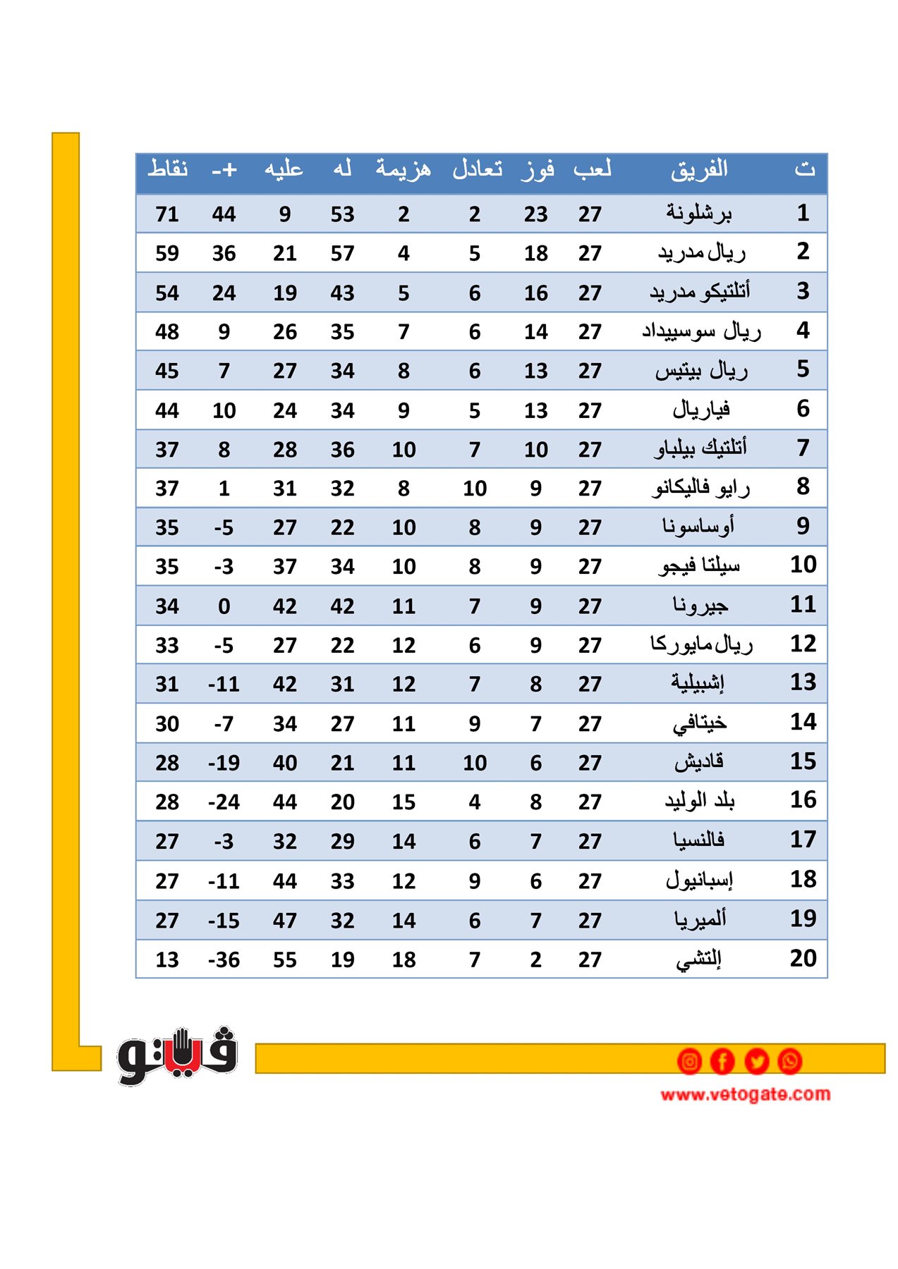ويحتل نادي برشلونة صدارة جدول ترتيب الدوري الإسباني برصيد 71 نقطة، متفوقا بفارق 12 نقطة كاملة عن ريال مدريد الوصيف بينما يحتل جيرونا المركز الـ11 برصيد 34 نقطة.