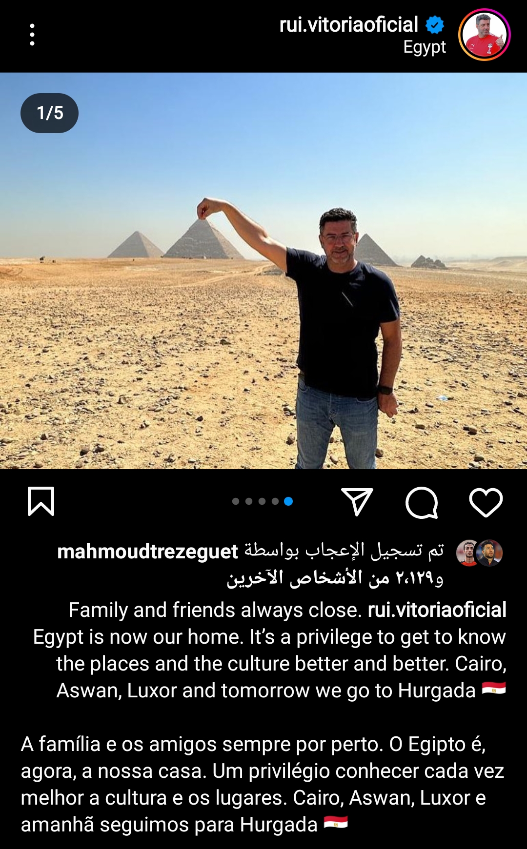 نشر البرتغالي روي فيتوريا، المدير الفني لمنتخب مصر، صورا عبر حسابه الشخصي على إنستجرام، من جولاته السياحية في مصر، معربًا عن فخره بالتعرف على الثقافة المصرية.