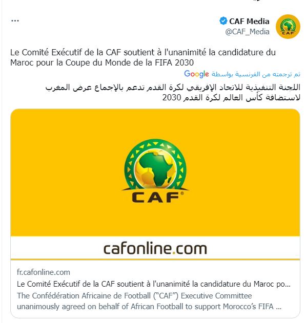 وفي سياق آخر، وافقت اللجنة التنفيذية للكاف بالإجماع نيابة عن كرة القدم الإفريقية على دعم ملف المغرب لاستضافة كأس العالم 2030.