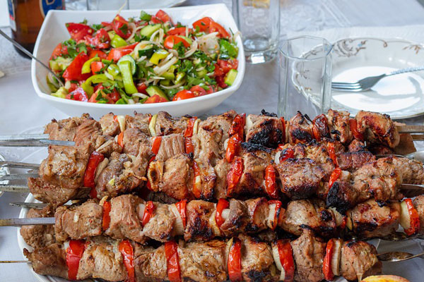 تقدم أسياخ اللحم مع الخضار السوتية.