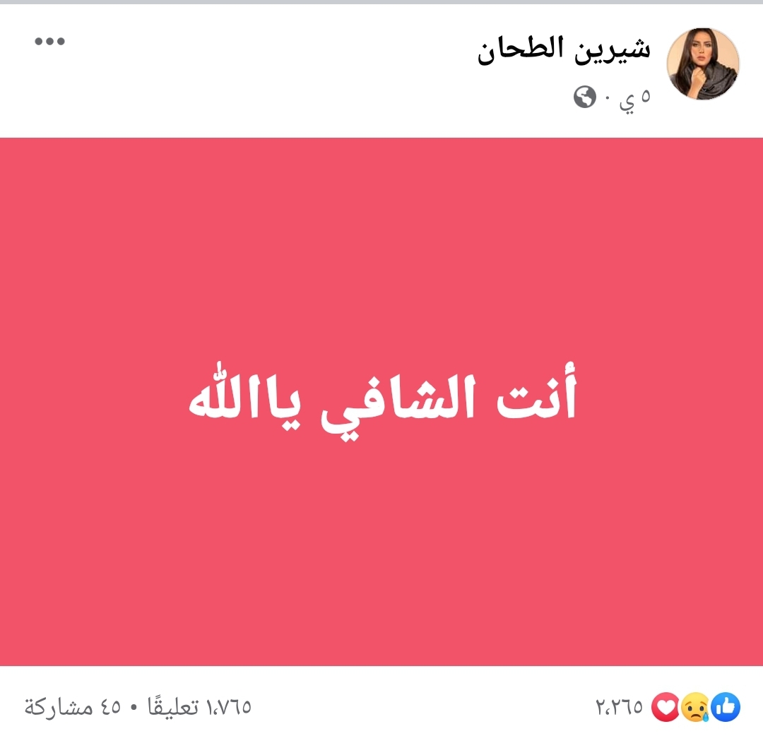 وفاة شيرين الطحان، نشرت الفنانة الراحلة شيرين الطحان آخر بوست لها على صفحتها بالفيس بوك وذلك قبل ٥ أيام من رحيلها طالبة من المولى عز وجل الشفاء حيث كتبت: "أنت الشافي يا الله".