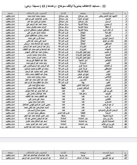 وجاءت أسماء المساجد المخصصة للاعتكاف على مستوى محافظة سوهاج وفق الكشف المرفق كالتالي: