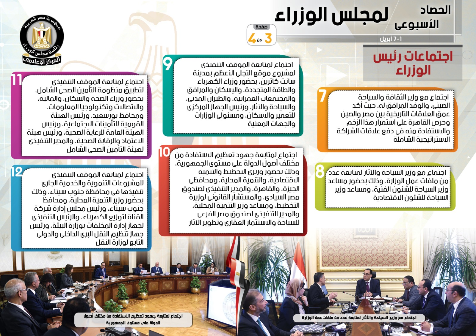 الحصاد الأسبوعي لمجلس الوزراء، نشاط مكثف واجتماعات موسعة (إنفوجراف)