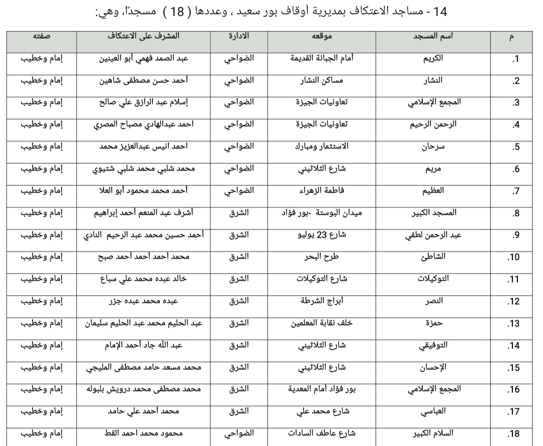 وجاءت أسماء المساجد المخصصة للاعتكاف على مستوى محافظة بورسعيد وفق الكشف المرفق كالتالي: