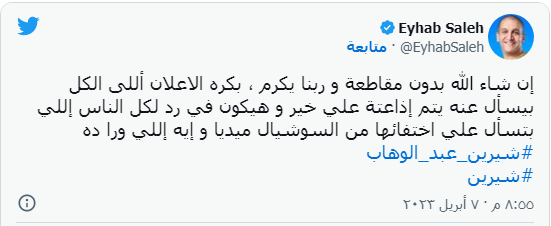 وقال عبر حسابه الرسمي بـ"تويتر": «إن شاء الله بدون مقاطعة وربنا يكرم، بكرة الإعلان اللي الكل بيسأل عنه يتم إذاعته على خير وهيكون في رد لكل الناس اللي بتسأل على اختفائها من السوشيال ميديا وإيه اللي ورا ده".