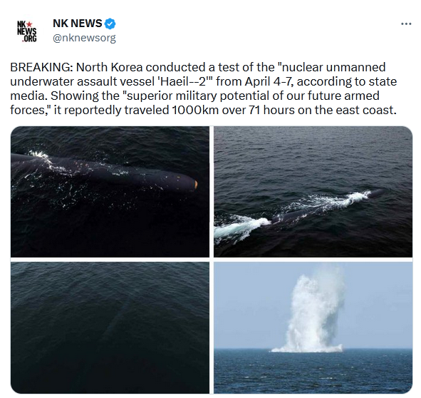 قالت وكالة الأنباء المركزية الكورية الرسمية، اليوم السبت، إن كوريا الشمالية أجرت اختبارًا لنظام أسلحة إستراتيجية تحت الماء في الفترة من الرابع إلى السابع من أبريل الحالي.