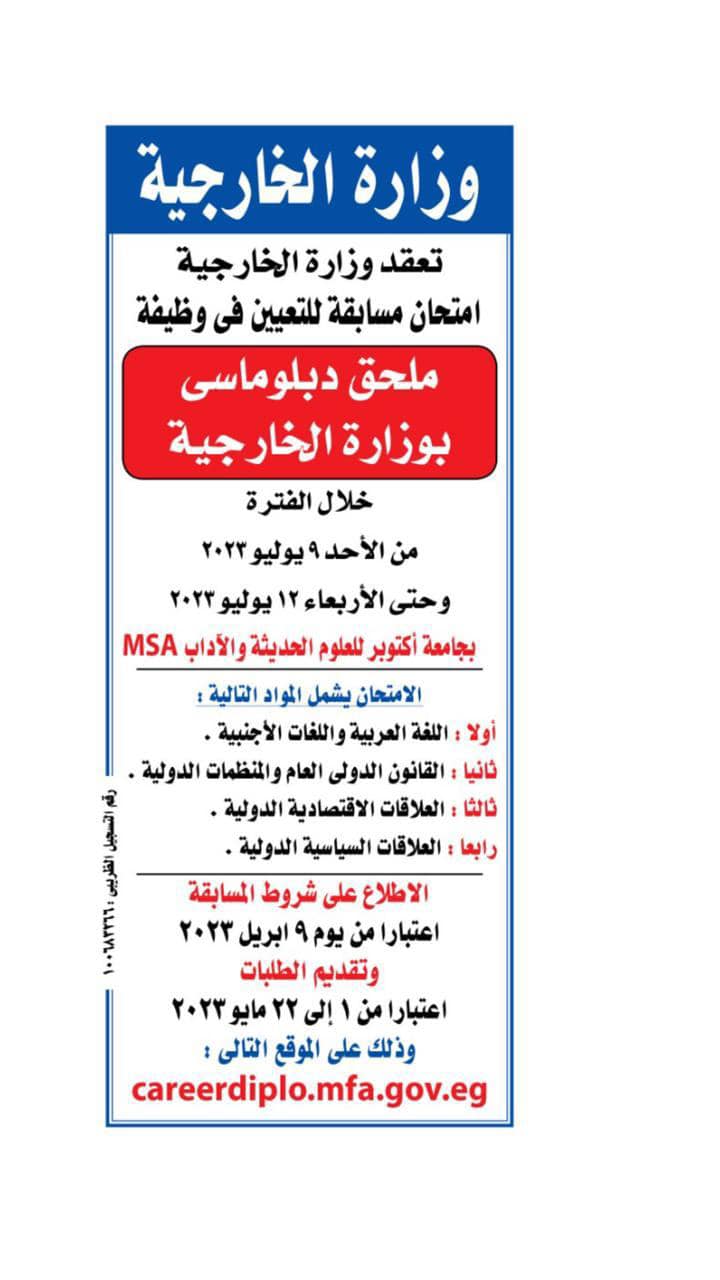 وتضمن إعلان وزارة الخارجية، الموعد المحدد لعقد امتحانات مسابقة تعيين الملحق الدبلوماسي، وذلك خلال الفترة تمتد من الأحد 9 يوليو 2023 إلى الأربعاء 12 يوليو 2023، وذلك في جامعة أكتوبر للعلوم الحديثة والأداب.