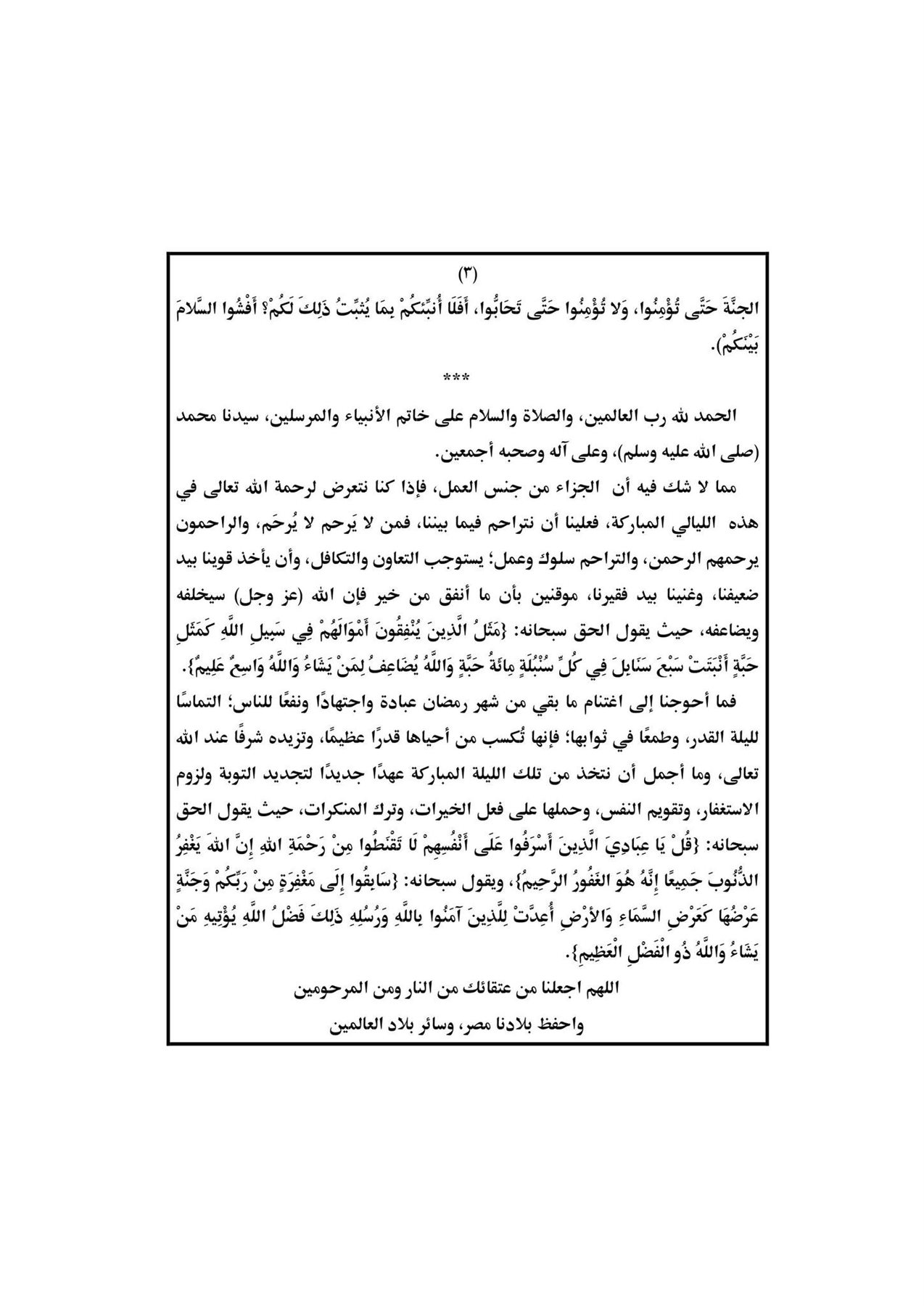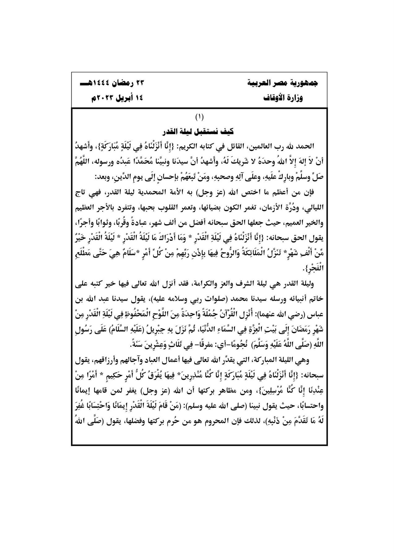 نشرت وزارة الأوقاف موضوع خطبة الجمعة القادمة 14 أبريل 2023م تحت عنوان: "كيف نستقبل ليلة القدر؟".