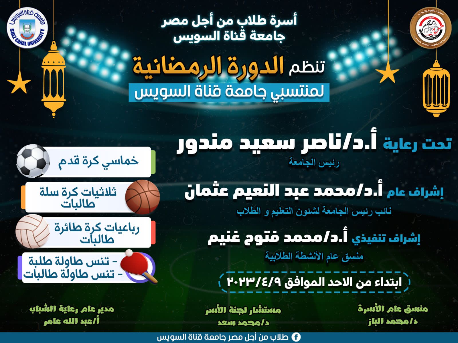 تُنظم أسرة طلاب من أجل مصر بجامعة قناة السويس، دورة رمضانية لمنتسبى الجامعة، وذلك تحت رعاية الدكتور ناصر مندور رئيس جامعة قناة السويس وبإشراف عام للدكتور محمد عبد النعيم نائب رئيس الجامعة لشئون التعليم والطلاب.