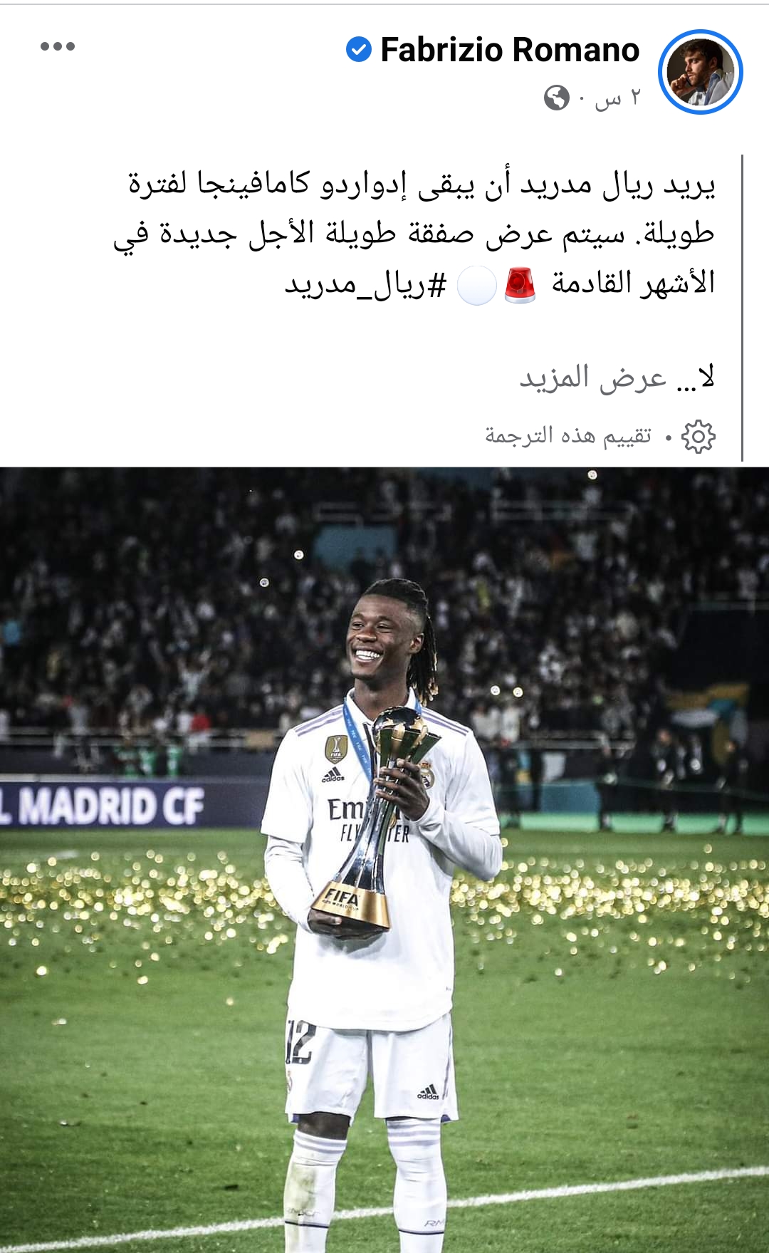 أكد الصحفي فابريزيو رومانو عن نية إدارة فريق ريال مدريد تقديم عقد طويل الأمد للاعب خط الوسط الفرنسي إدوارد كامافينجا البالغ من العمر 20 عاما وذلك بسبب المستويات الجيدة التي يقدمها اللاعب رفقة الفريق الملكي، وكذلك مستواه في الكلاسيكو الماضي أمام فريق برشلونة.