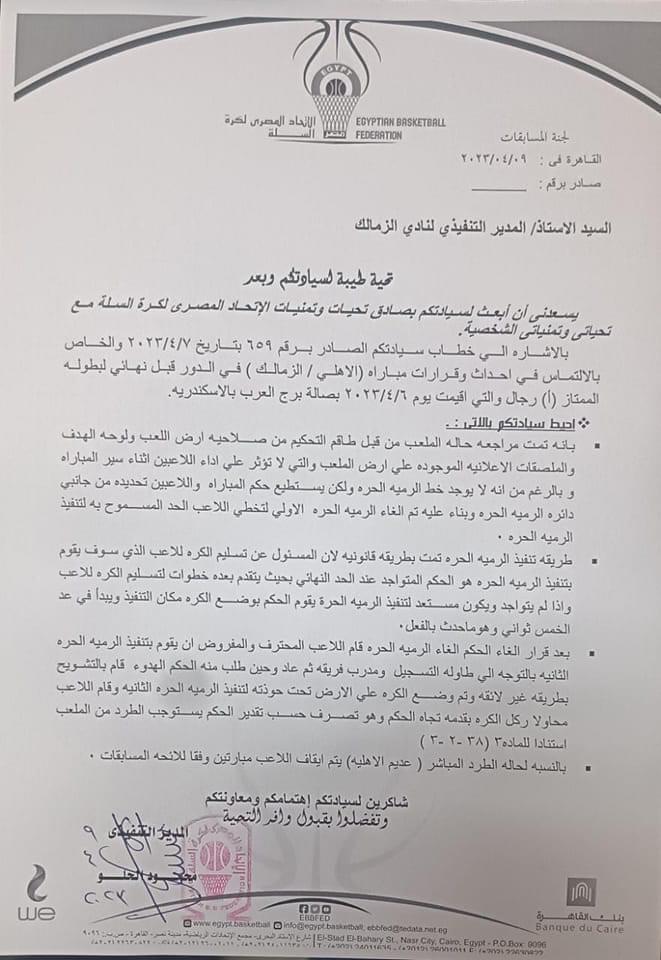 الاتحاد المصري لكرة السلة يرفض استئناف الزمالك