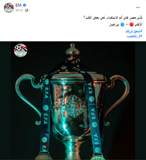ونشر اتحاد الكرة عبر حسابه الرسمي على موقع التواصل فيسبوك صورة لكأس مصر، وعلق عليها “كأس مصر على أتم الإستعداد.. الأهلي × بيراميدز.. شجع فريقك.. لا للتغصب”.