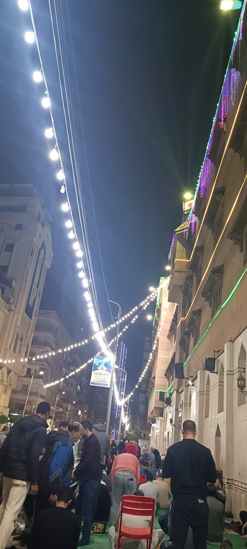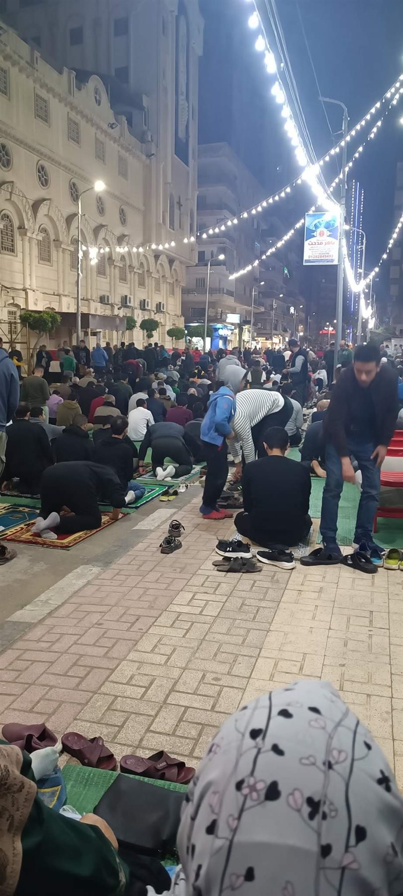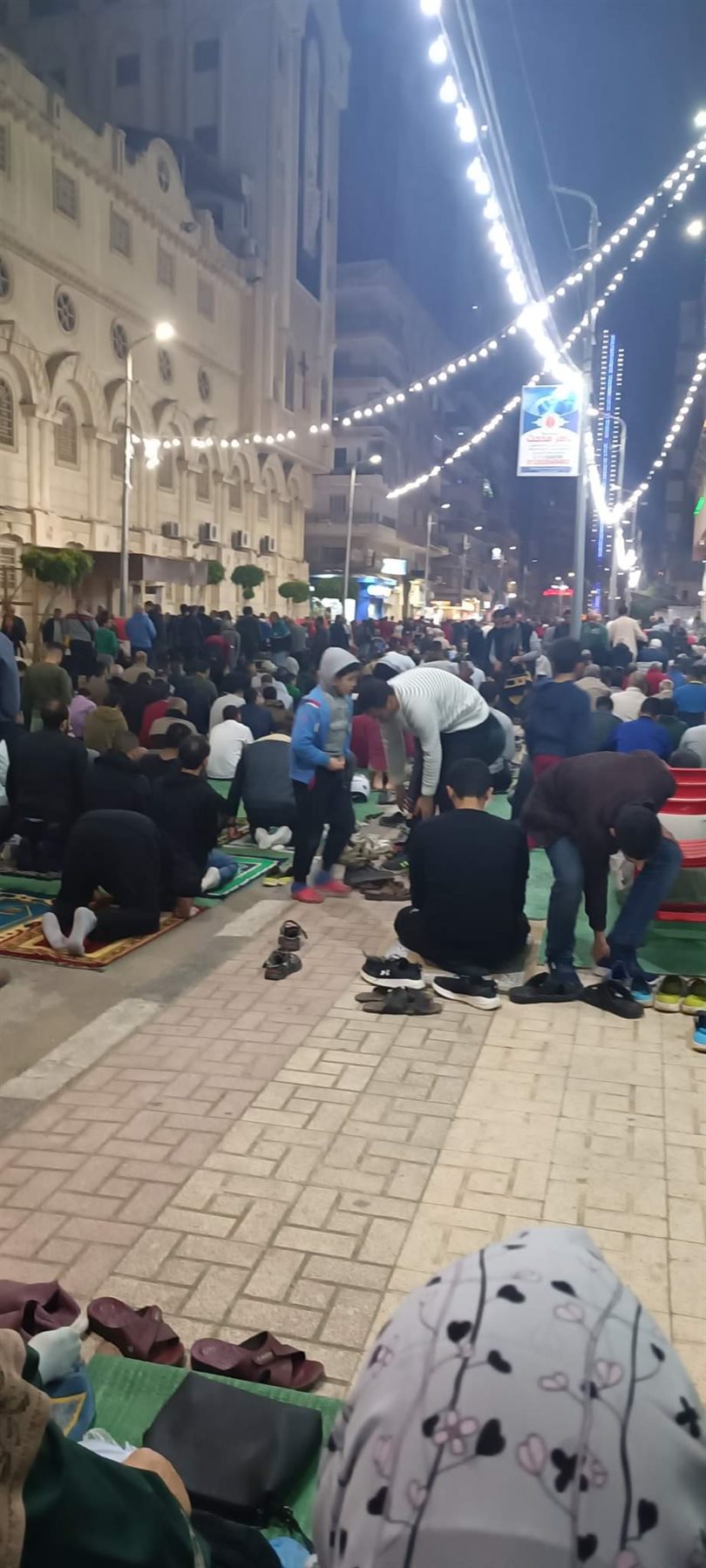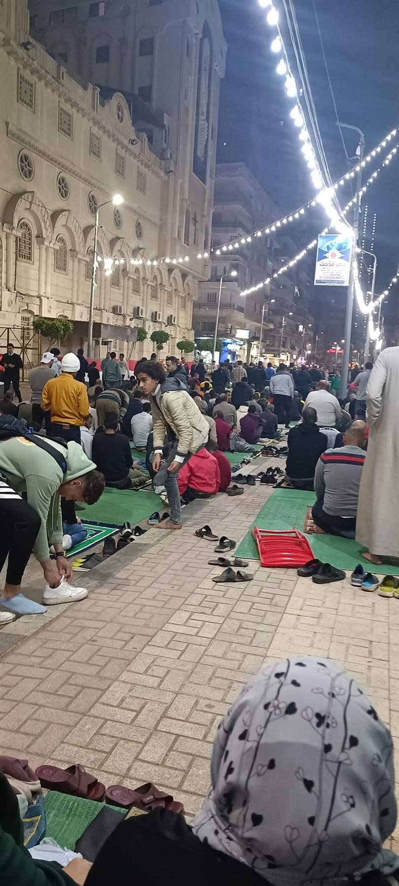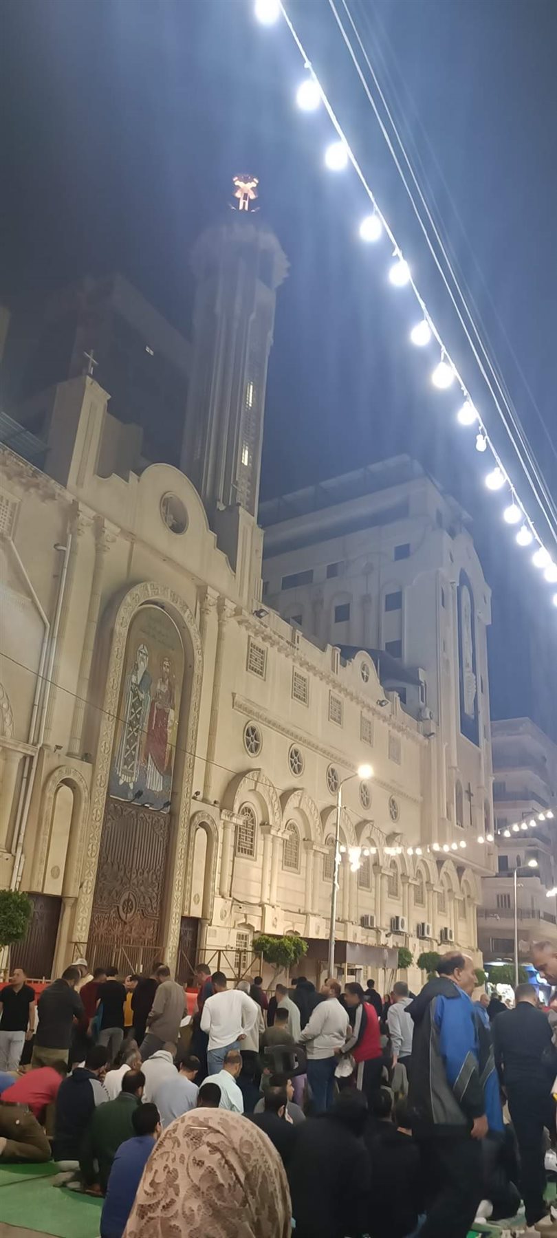 واصطف المصلون أمام المسجد والكنيسة لأداء صلاة العشاء والتراويح، بالتزامن مع أداء قداس عيد السعف وتبادل كلا المصلين التحية والتهنئة بالعيد عقب الدخول والخروج من الكنيسة والمسجد وهو مشهد يتكرر عندما تأتي الأعياد معا، وتكرر للمرة الثانية في شهر رمضان للمسجد والكنيسة المتقابلين.