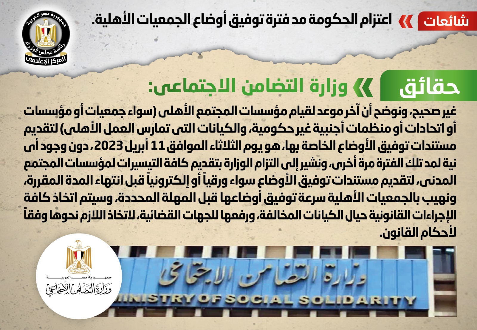 وأكدت وزارة التضامن أنه لا صحة لمد فترة توفيق أوضاع الجمعيات الأهلية، مُوضحةً أن أخر موعد لقيام مؤسسات المجتمع الأهلي (سواء جمعيات أو مؤسسات أو اتحادات أو منظمات أجنبية غير حكومية، والكيانات التي تمارس العمل الأهلي) لتقديم مستندات توفيق الأوضاع الخاصة بها، هو يوم الثلاثاء الموافق 11 أبريل 2023، دون وجود أي نية لمد تلك الفترة مرة أخرى.