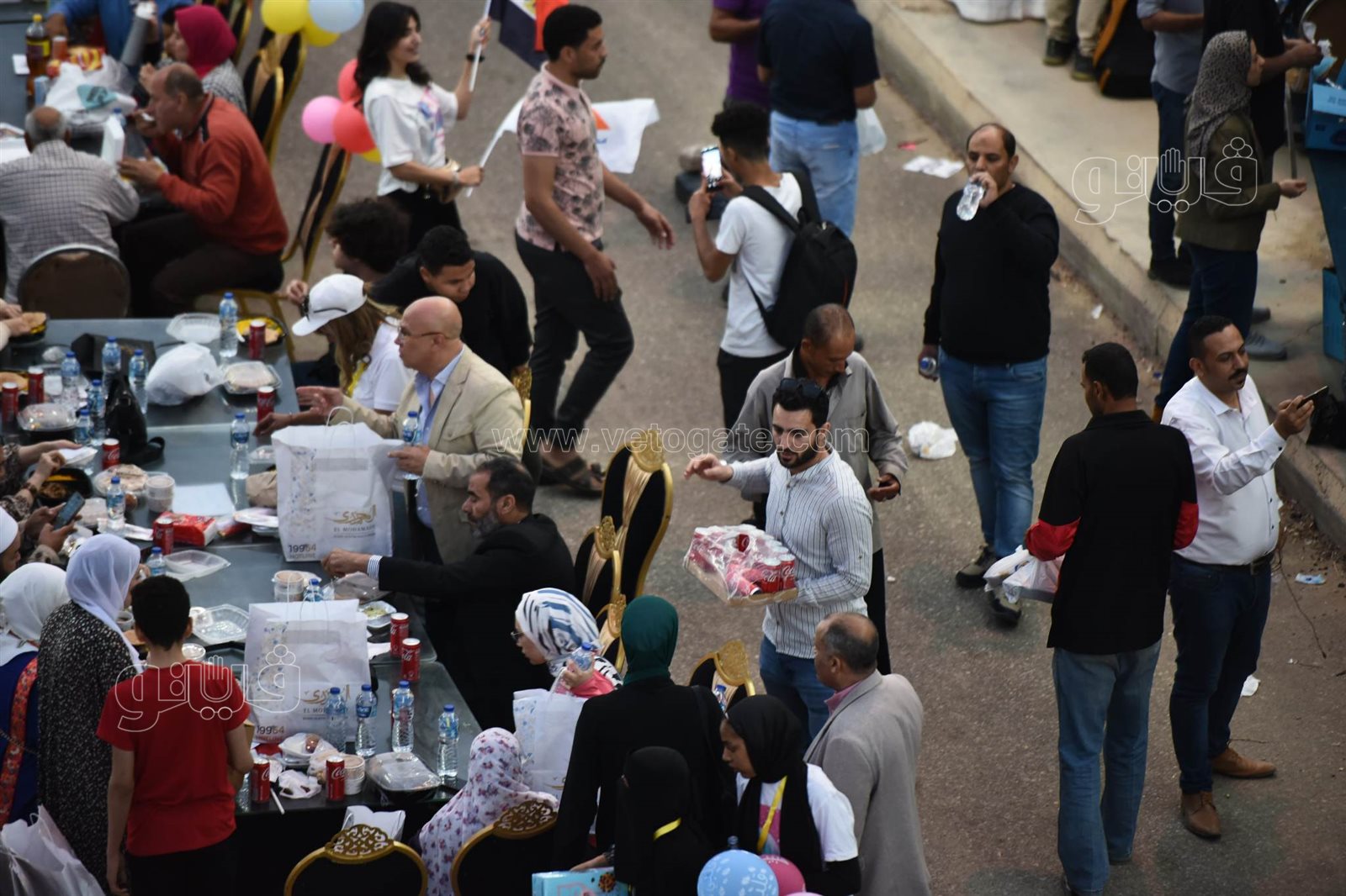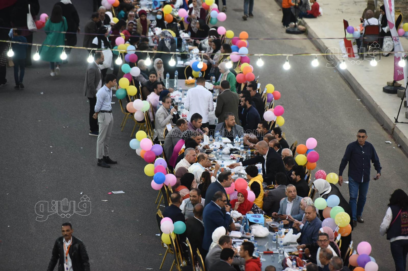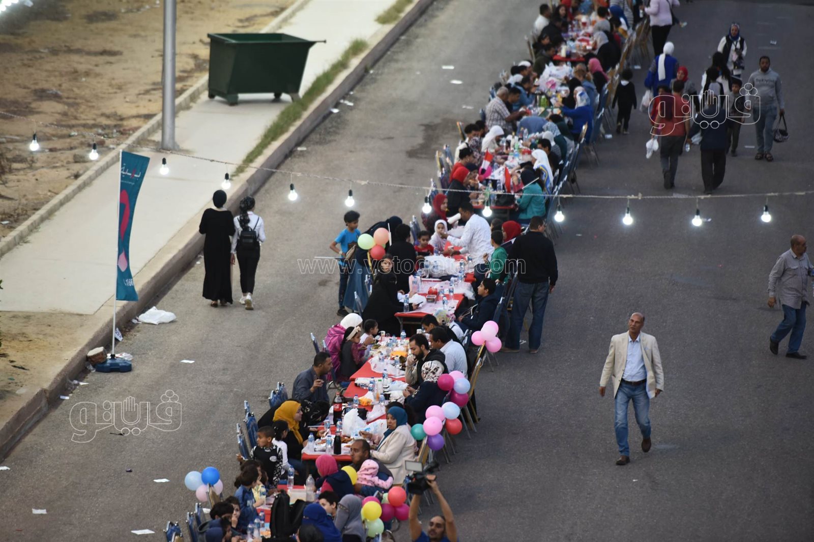 ورصدت عدسة فيتو حجم وطول مائدة الإفطار التي امتدت على طول الشارع، وسط حالة من السعادة سيطرت على الحضور خاصة مع الفقرات الترفيهية وانتشار عرائس رمضان وشخصيات بوجي وطمطم وبكار للعب مع الأطفال.