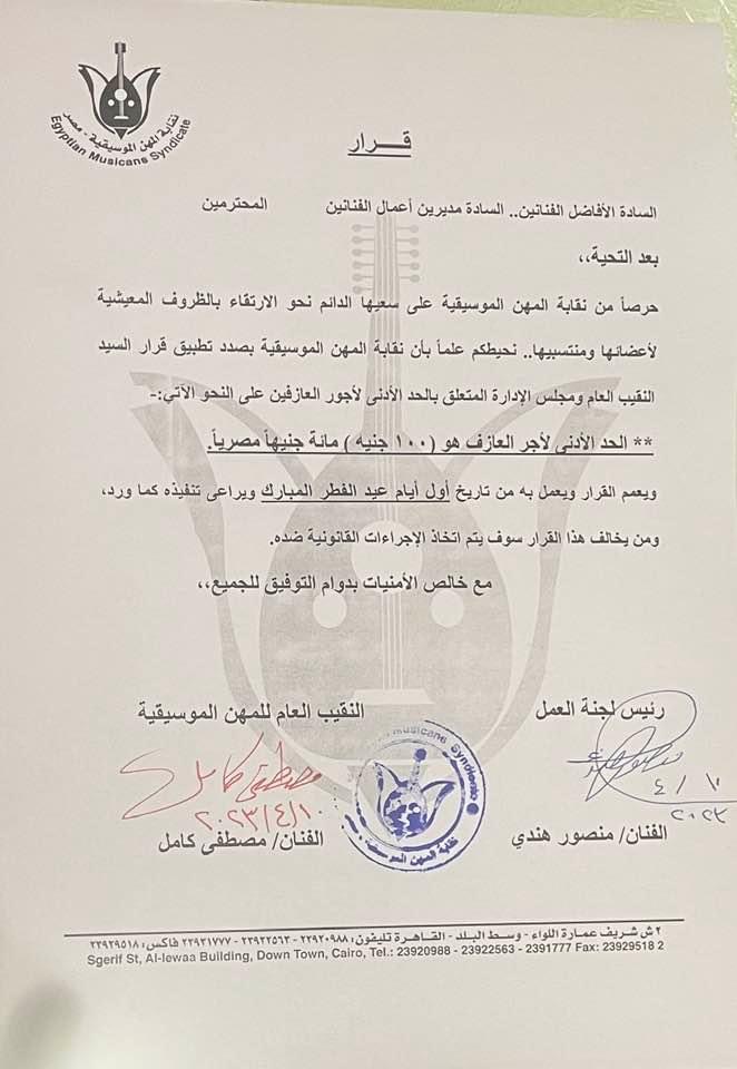 وتابع الفنان مصطفي كامل نقيب المهن الموسيقية في بيانه: "راجيًا من الجميع الالتزام ومراعاة زملائهم في ظل هذه الظروف الصعبة وغلاء المعيشة، والمقصد من هذا القرار هم تحديدًا الزملاء عازفي الدفوف والإيقاع".
