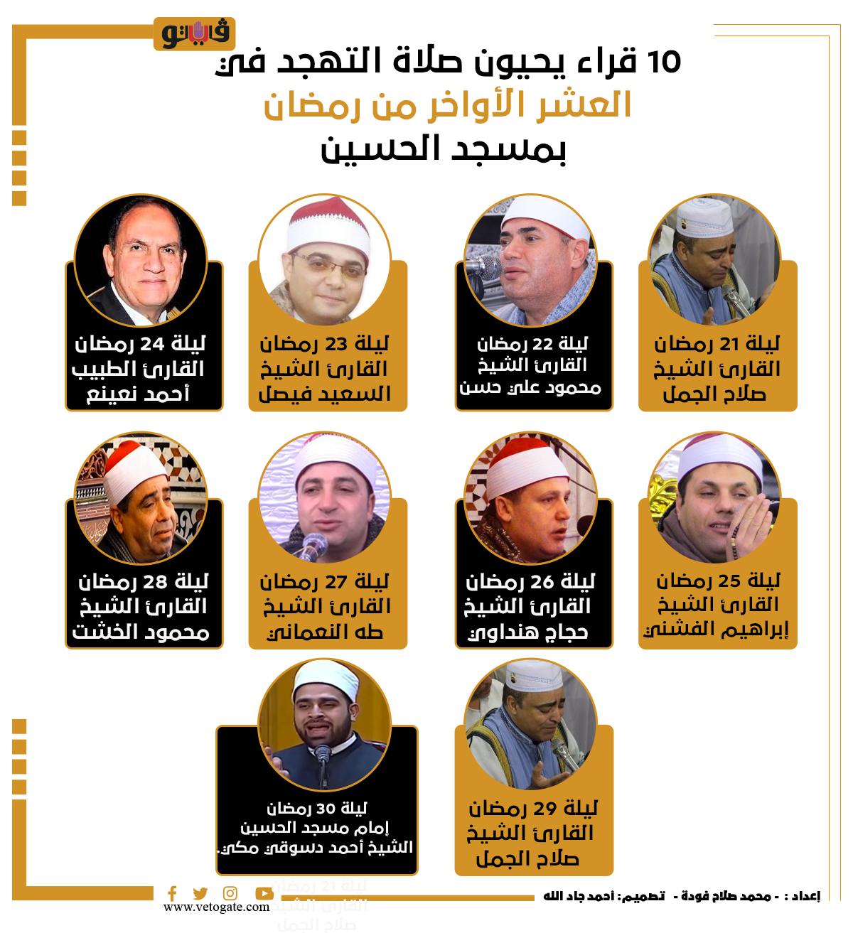 10 قراء يحيون صلاة التهجد في العشر الأواخر من رمضان بمسجد الحسين (إنفوجراف) الثلاثاء 11/أبريل/2023 - 12:40 م 4/11/2023 12:40:02 PM قراء صلاة التهجد بالعشر الأواخر من رمضان بمسجد الحسين، فيتو - محمد صلاح فودة شارك طباعة 18 حجم الخط شارك طباعة الشيخ صلاح الجمل الشيخ محمود الخشت الشيخ حجاج هنداوي الشيخ طه النعماني العشر الأواخر من رمضان الشيخ محمود علي حسن القارئ الشيخ محمود علي حسن صلاة التهجد مسجد الحسين