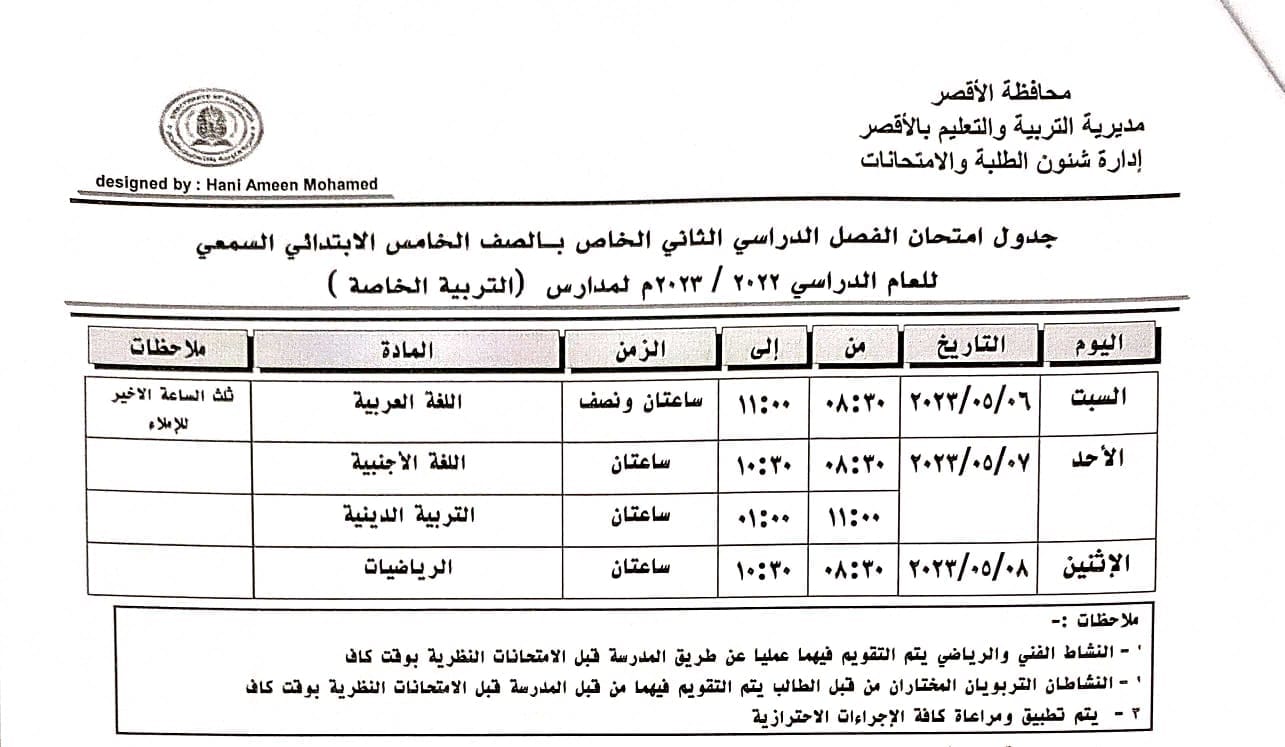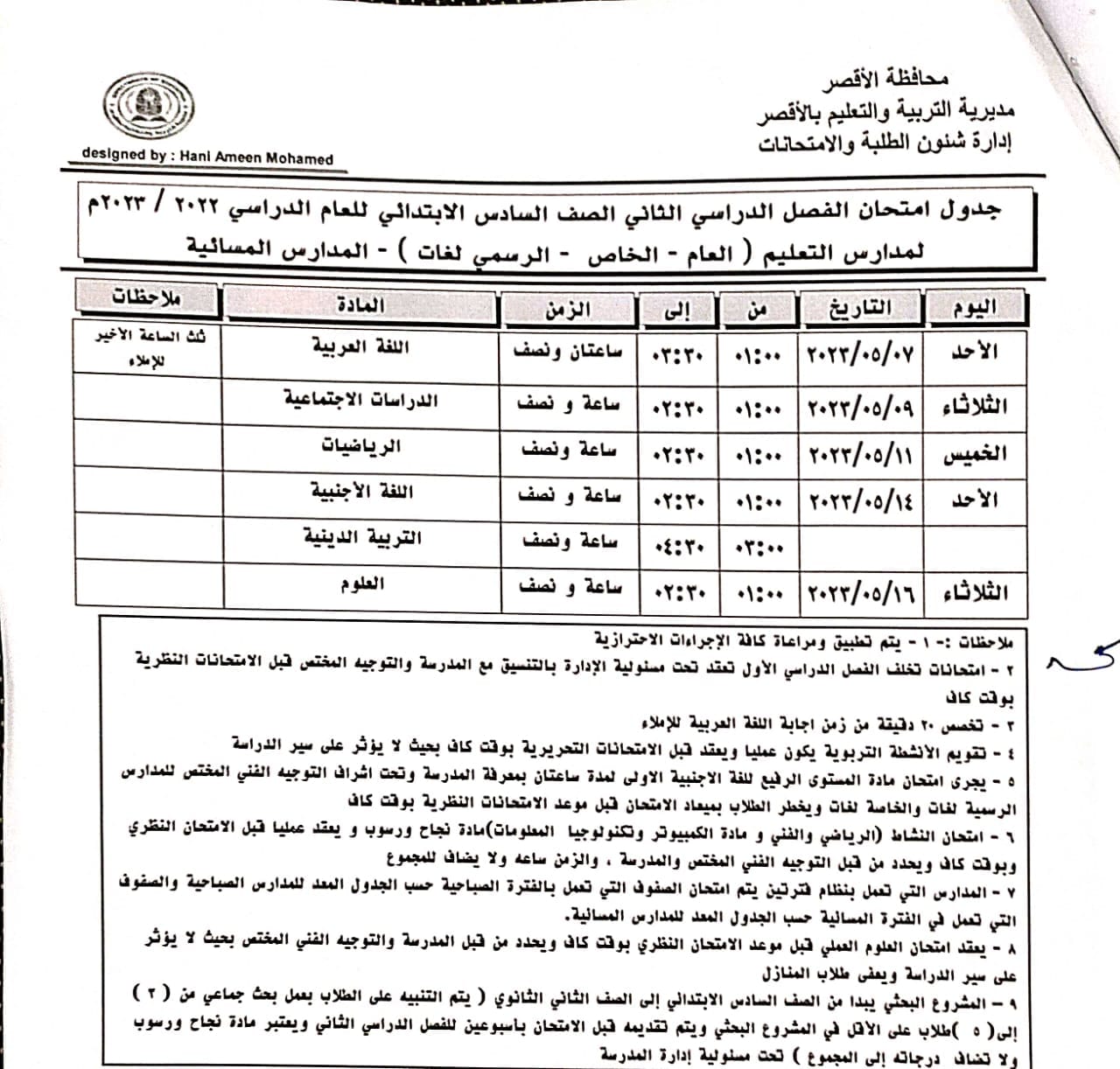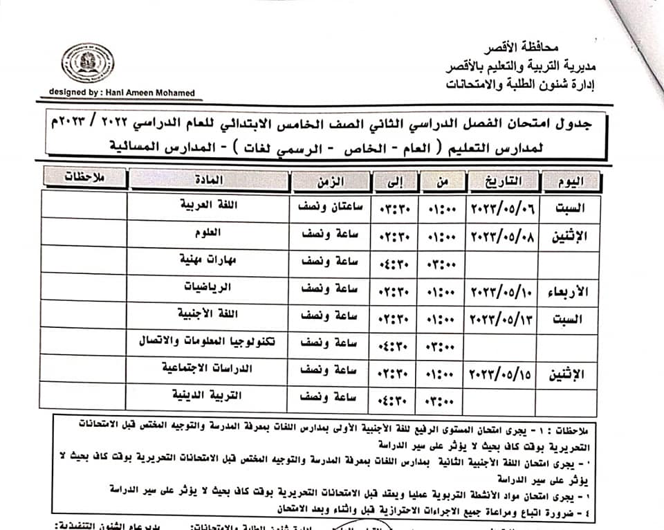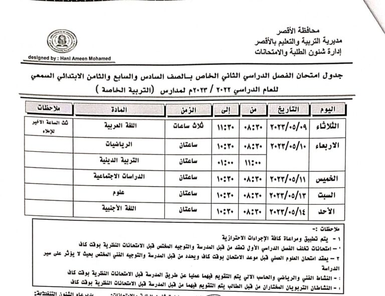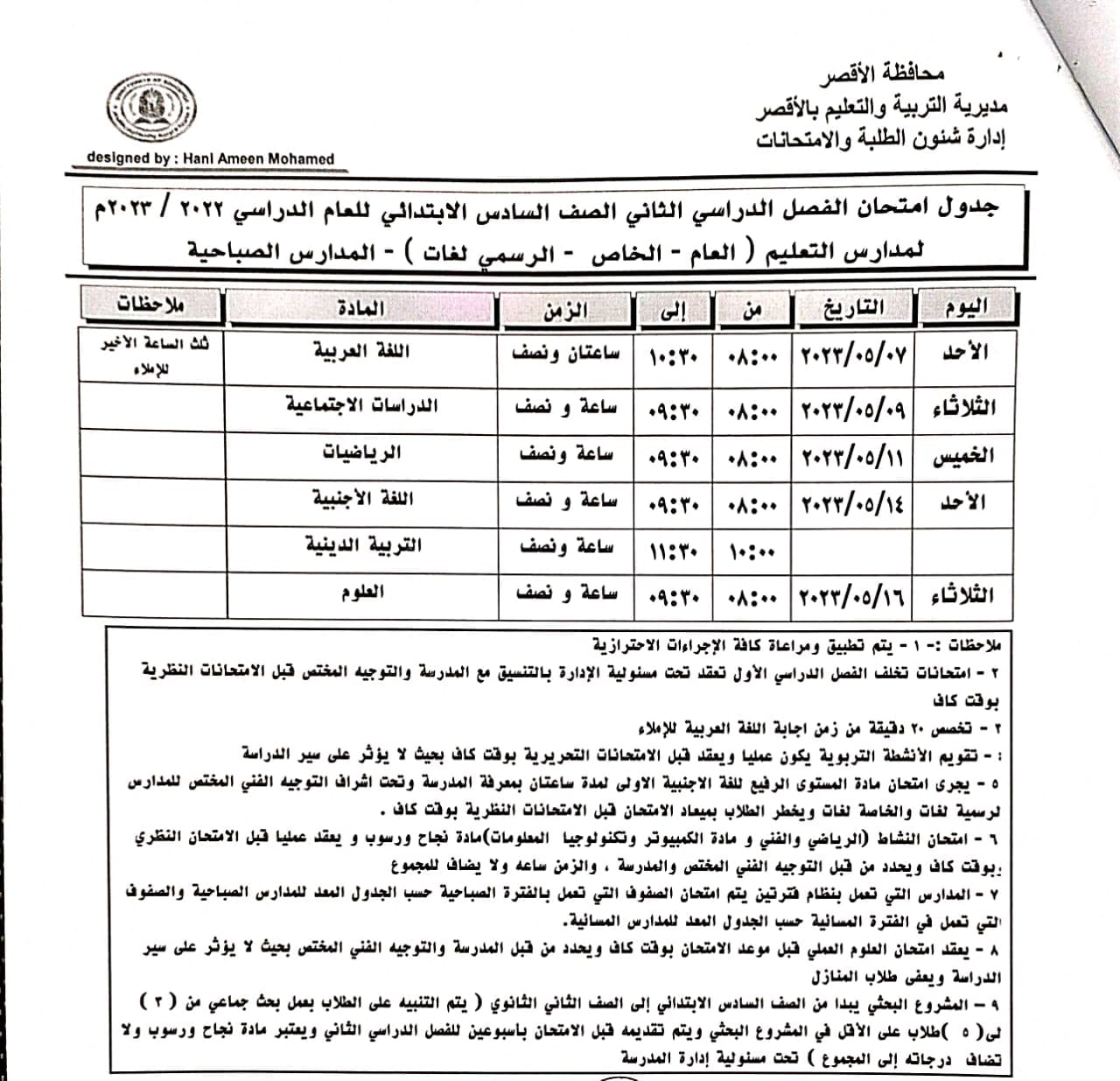 أعلنت مديرية التربية والتعليم بمحافظة الأقصر، جداول امتحانات الفصل الدراسي الثاني 2023، لمرحلة التعليم الابتدائي لصفوف الرابع والخامس والسادس الابتدائي، لمدارس التعليم العام والخاص والرسمي لغات.