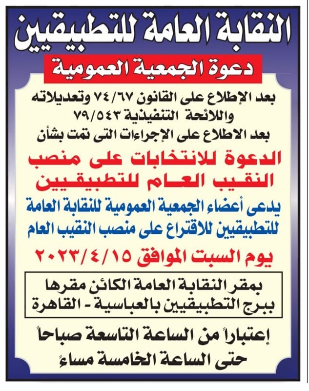 أعلنت نقابة التطبيقيين عن انعقاد الجمعية العمومية للنقابة للاقتراع على منصب النقيب العام يوم السبت الموافق ٢٠٢٣/٤/١٥، بمقر النقابة العامة ببرج التطبيقيين بالعباسية - القاهرة.