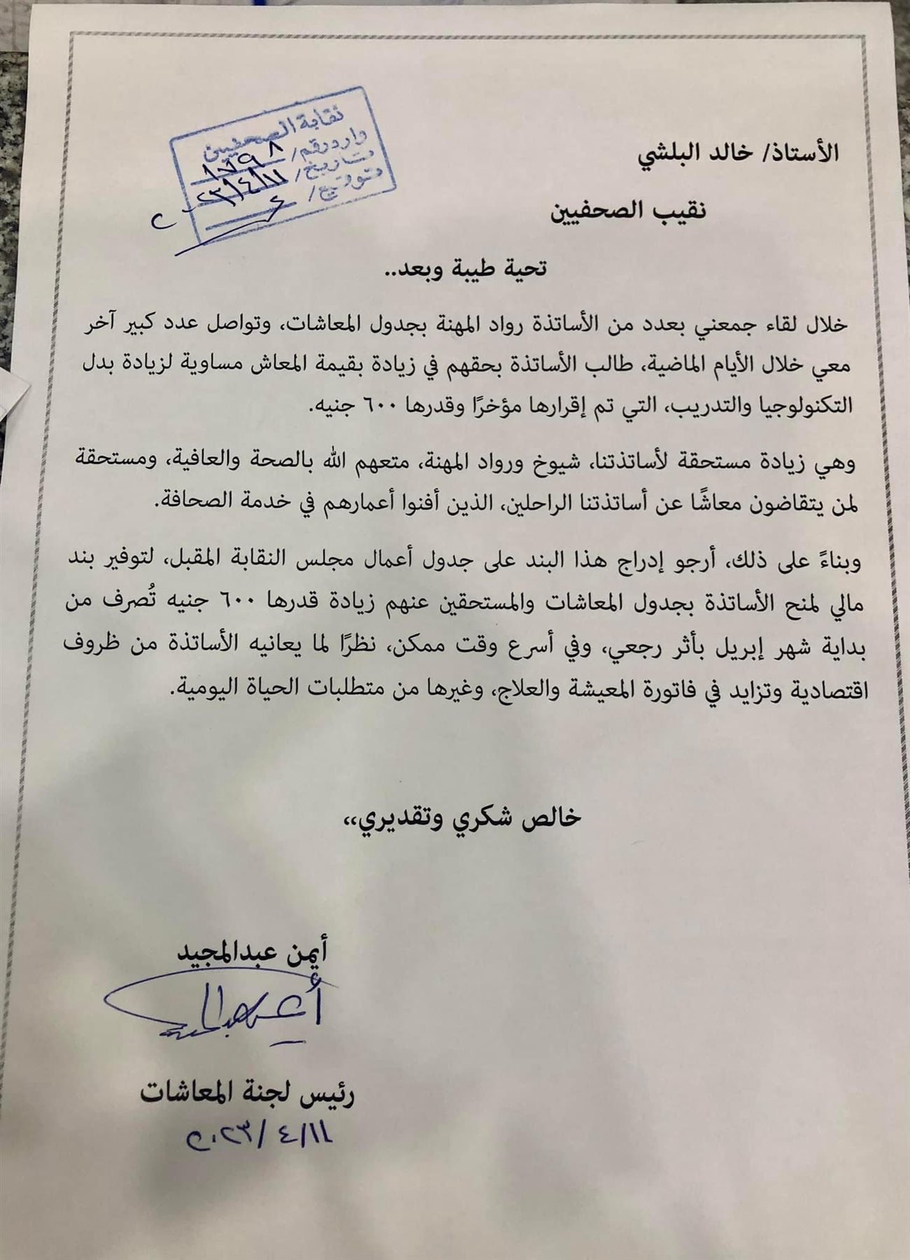 وأضاف:" وبناءً على ذلك، أرجو إدراج هذا البند على جدول أعمال مجلس النقابة المقبل، لتوفير بند مالي لمنح الأساتذة بجدول المعاشات والمستحقين عنهم زيادة قدرها 600 جنيه تُصرف من بداية شهر إبريل بأثر رجعي، وفي أسرع وقت ممكن، نظرًا لما يعانيه الأساتذة من ظروف اقتصادية وتزايد في فاتورة المعيشة والعلاج، وغيرها من متطلبات الحياة اليومية.