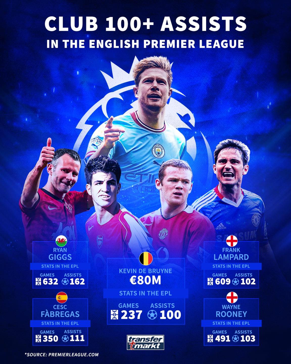1_يتصدر القائمة اللاعب الويلزي والتاريخي لنادي مانشستر يونايتد ريان جيجز برصيد 162 أسيست في 632 مباراة خاضها في الدوري.