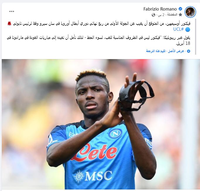وأضاف: أوسيمين ظروف إصابته لا تصلح للتضحية به في مباراة الذهاب فهو يريد الراحة لسوء الحظ لن يتواجد كأساسيا أمام ميلان في ذهاب الدور ربع النهائي لدوري أبطال أوروبا.