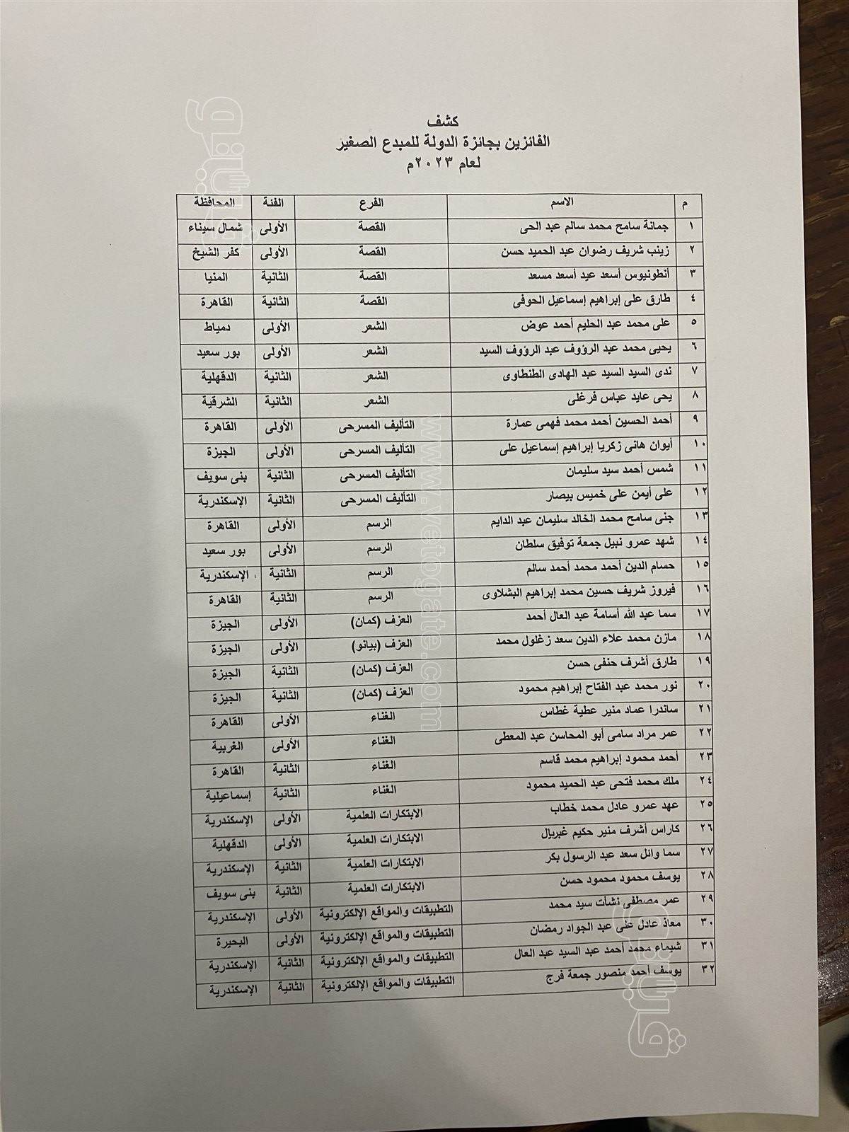 وكانت الدكتورة نيفين الكيلاني وزيرة الثقافة، أعلنت، اليوم، عن الفائزين بجائزة الدولة للمبدع الصغير في دورتها الثالثة بفروعها المختلفة، والتي تقام تحت رعاية السيدة انتصار السيسي حرم رئيس الجمهورية، وذلك في قاعة المؤتمرات بالمجلس الأعلى للثقافة بدار الأوبرا المصرية، بحضور الدكتور هشام عزمي أمين عام المجلس.