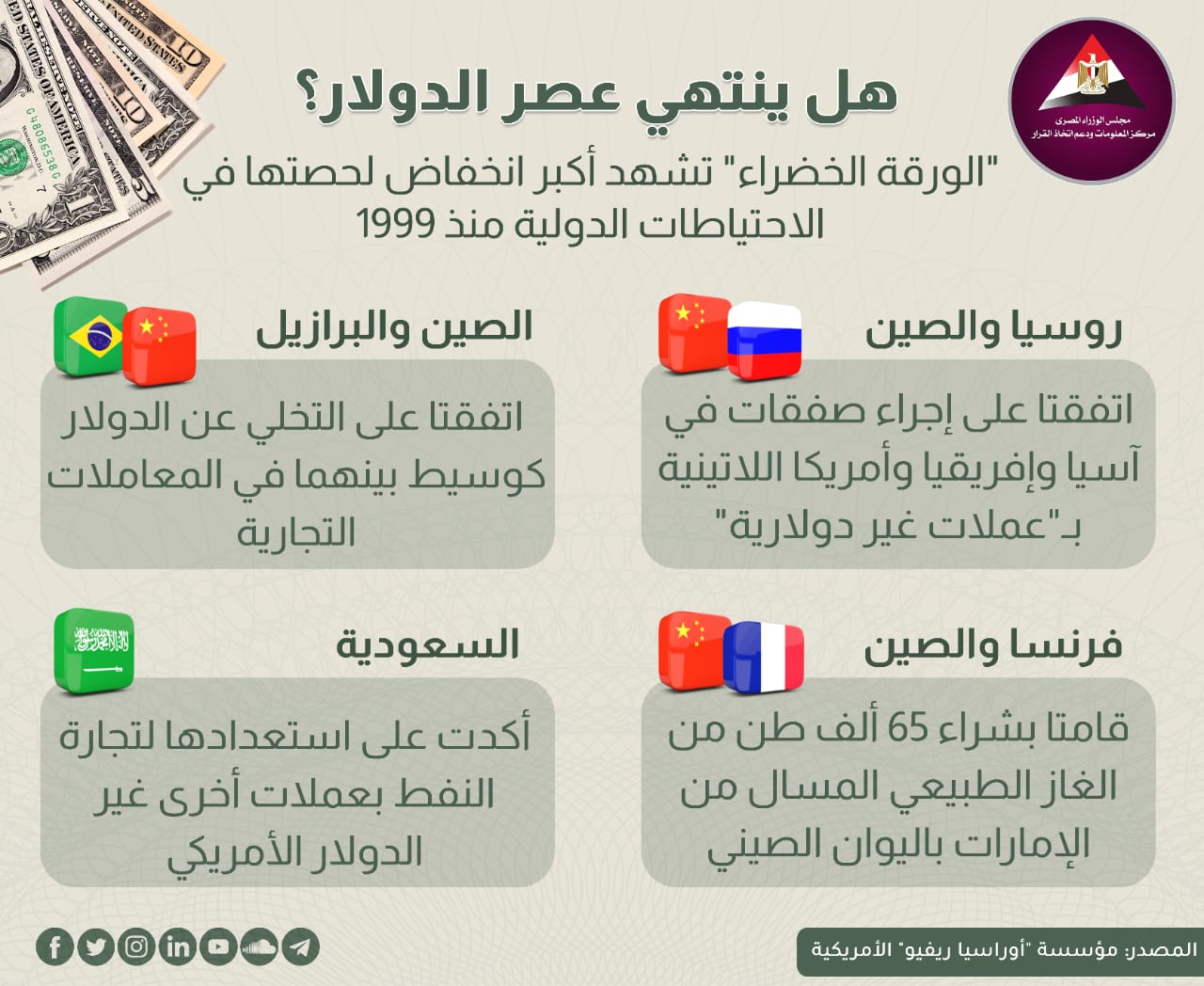 استعرض مركز المعلومات ودعم اتخاذ القرار بمجلس الوزراء، المسارات المستقبلية للدولار الأمريكي، في ظل تزايد الاعتماد على اليوان الصيني كعملة وسيطة في المعاملات التجارية بدلًا من الدولار، وذلك استنادًا إلى تحليل نشرته مؤسسة "أوراسيا ريفيو" الأمريكية للدراسات والبحوث.