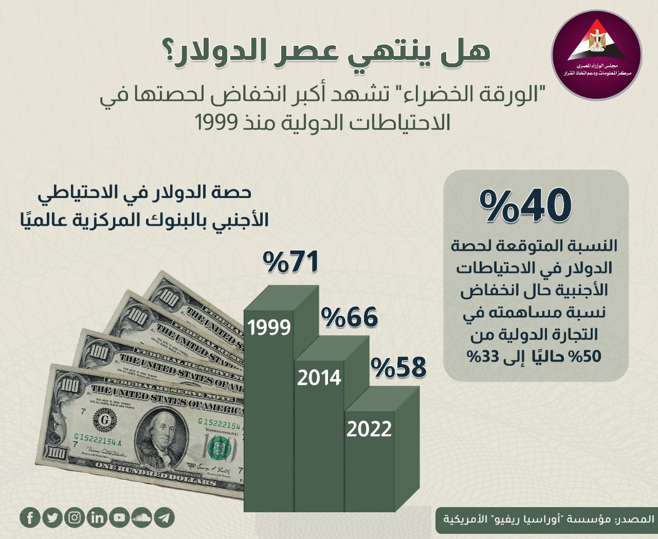 وأوضح الإنفوجراف، أن هناك توقعات بأن تستمر رحلة تراجع حصة الدولار في الاحتياطات الأجنبية العالمية، حال انخفاض نسبة مساهمته في حجم التجارة الدولية، والتي تبلغ حاليًا ٥٠ ٪ من إجمالي المعاملات التجارية العالمية، مشيرًا إلى أن حصة الدولار من الاحتياطات الدولية قد تنخفض إلى ٤٠ ٪ حال انخفاض نسبة مساهمته في التجارة الدولية إلى الثلث بدلًا من النصف حاليًا، بما يشير إلى تأثير استمرار الاعتماد على اليوان الصيني والعملات غير الدولارية الأخرى على هيمنة "الورقة الخضراء" على الاقتصاد العالمي، ونفوذها الذي اكتسبته أعقاب الحرب العالمية الثانية خلفًا للجنيه الاسترليني.