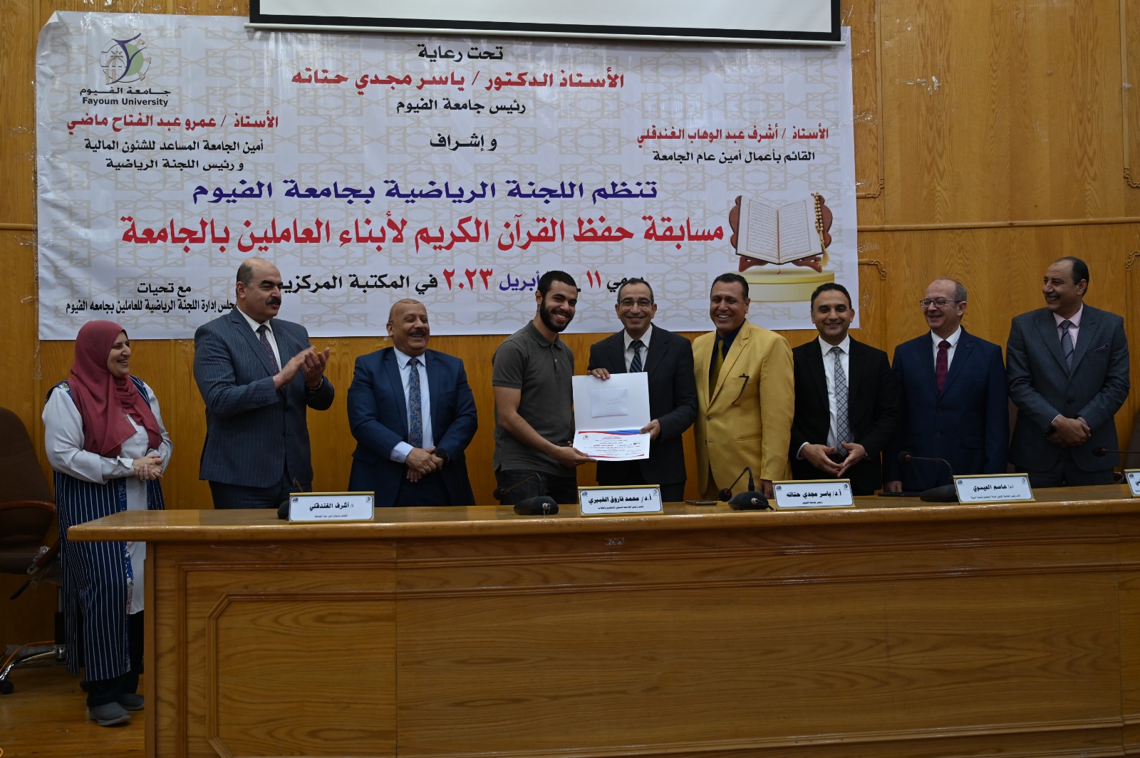 كرم الدكتور ياسر مجدي حتاتة رئيس جامعة الفيوم، الفائزين في مسابقة حفظ وتلاوة القرآن الكريم لأبناء الإداريين بالجامعة، في الاحتفال الذي نظمته اللجنة الرياضية، اليوم الأربعاء.