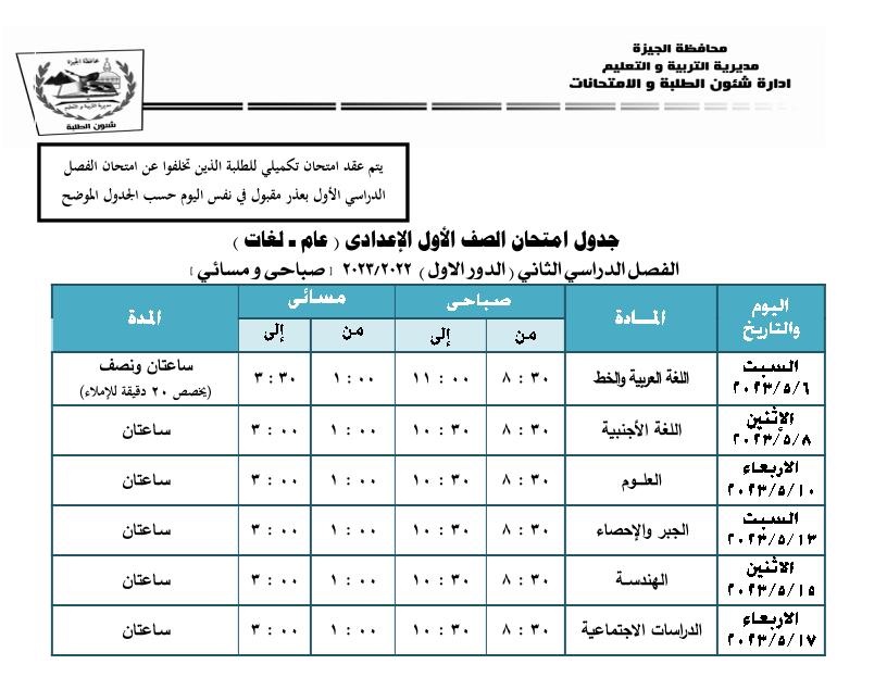 الصف الأول الإعدادي ( عام ,صم، مكفوفين، مهنى) يبدأ من السبت 6 / 5 / 2023 إلي الأربعاء 17 / 5 / 2023